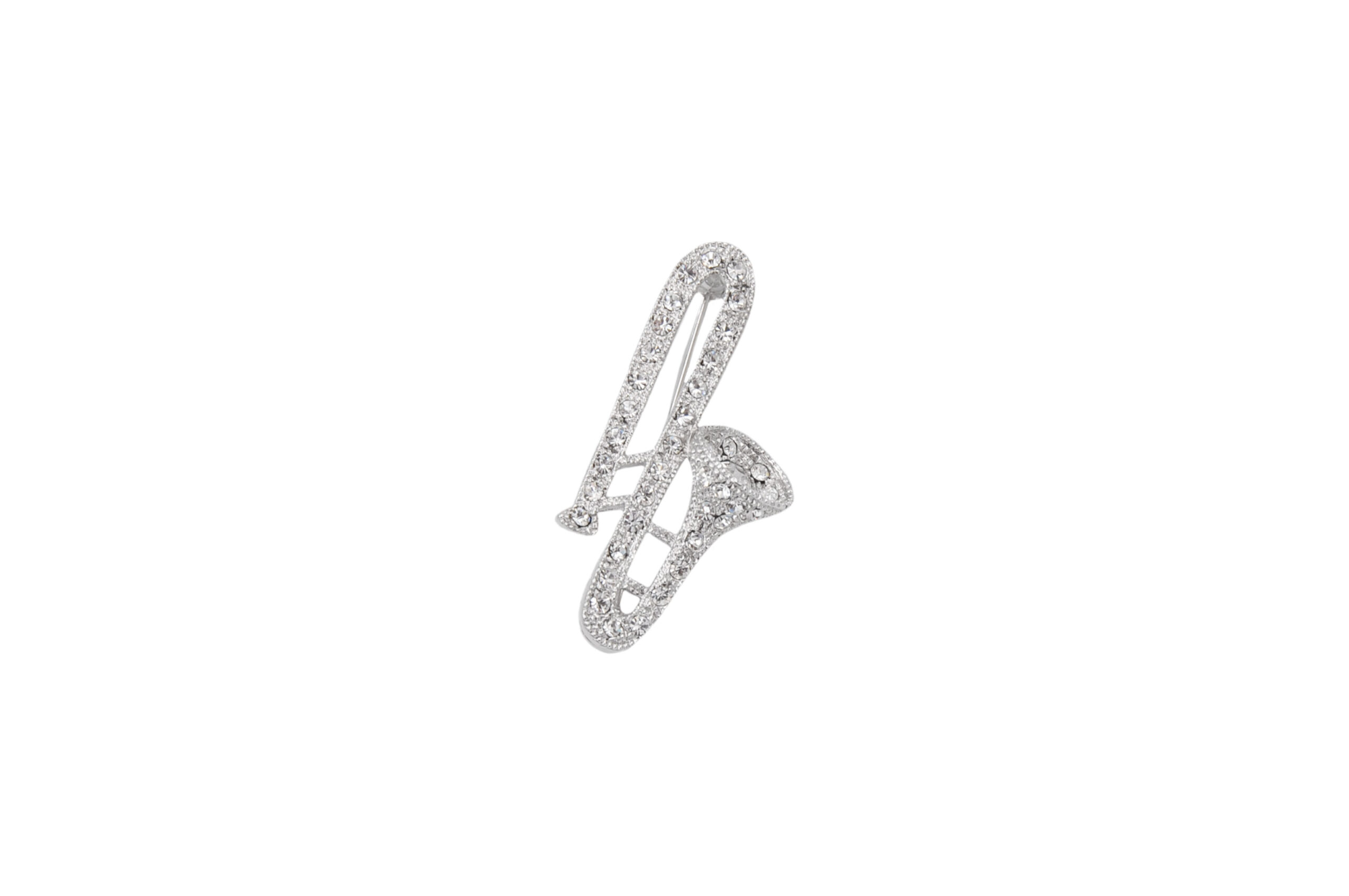Spilla rodio tromba strass in metallo e vetro, misure 2 x 3,5 cm, sacchetto in organza incluso