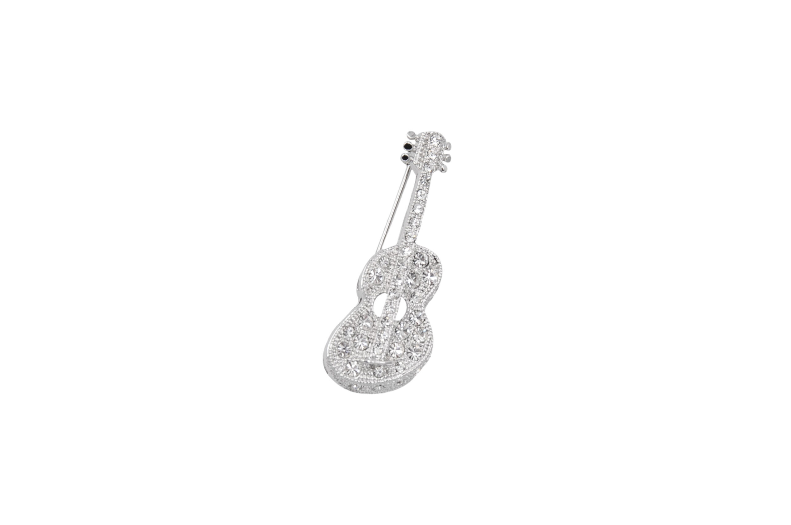 Spilla rodio chitarra strass in metallo e vetro, misure 1,5 x 4 cm, sacchetto in organza incluso