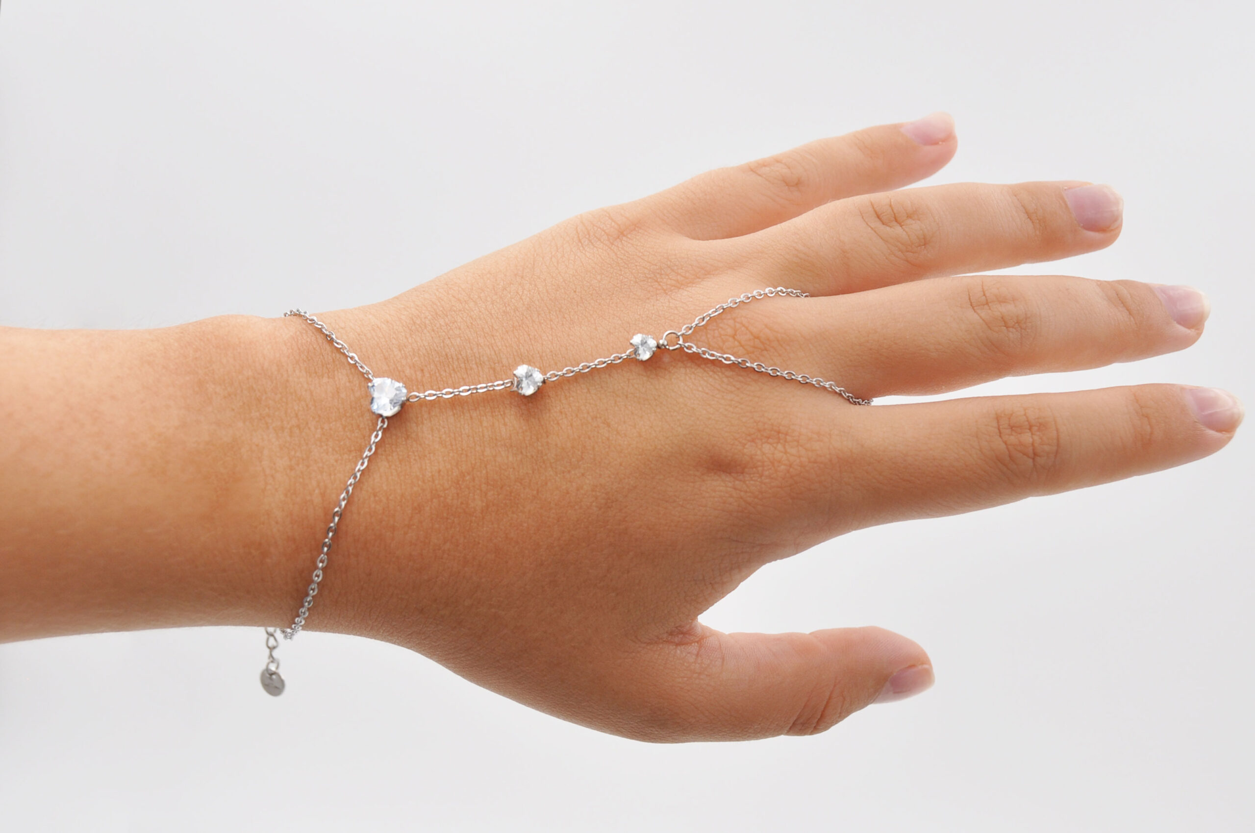 Bracciale baciamano rodio con cuori in metallo e vetro, confezione 3 pezzi, sacchetto in organza incluso