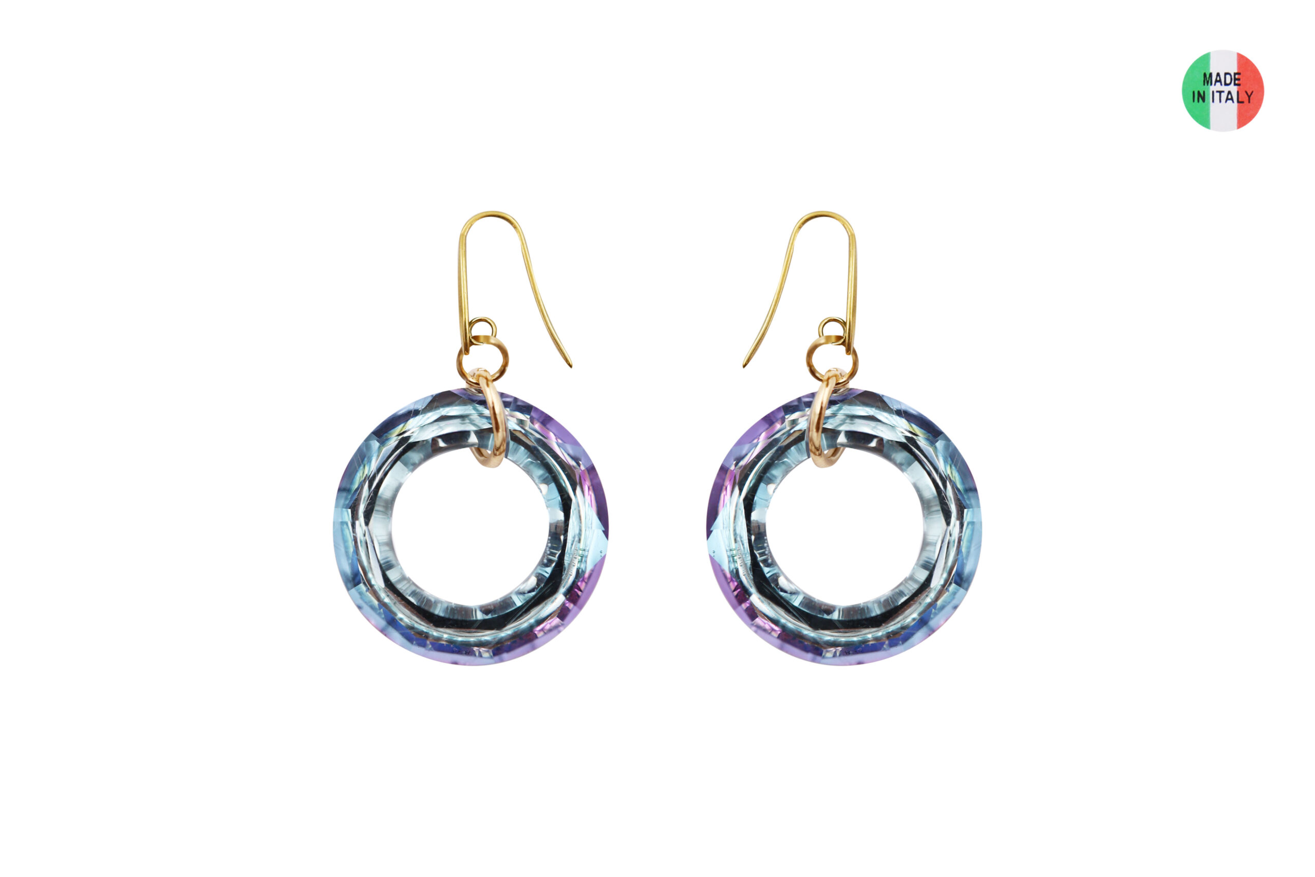 Orecchino amo con cristallo in metallo e vetro, disponibile oro/azzurro, oro/beige, oro/viola, rodio/azzurro, rodio/beige e rodio/viola, lunghezza 5 cm, sacchetto in organza incluso