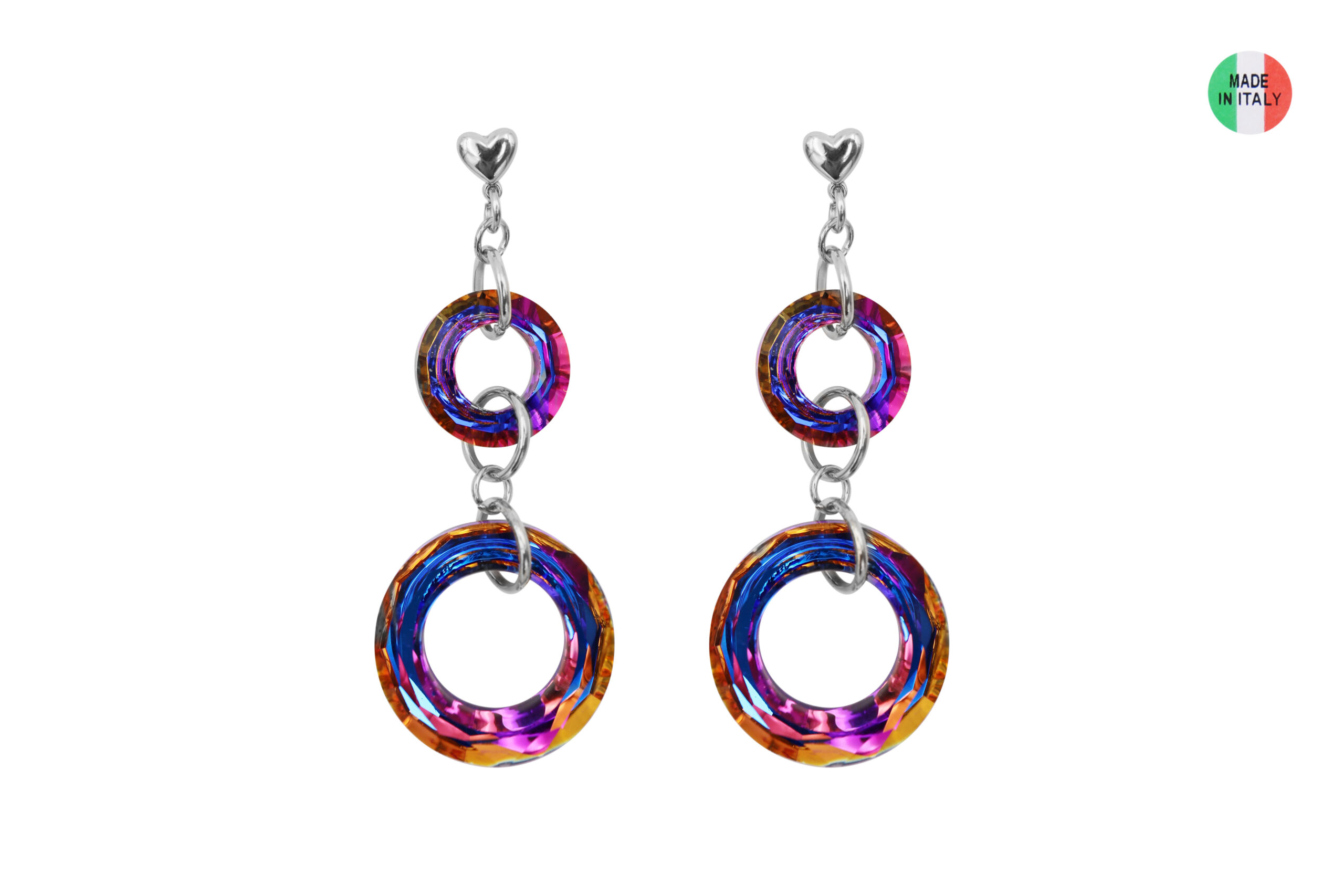 Orecchino perno con cristalli in metallo e vetro, disponibile oro/azzurro, oro/beige, oro/viola, rodio/azzurro, rodio/beige e rodio/viola, lunghezza 8 cm, sacchetto in organza incluso
