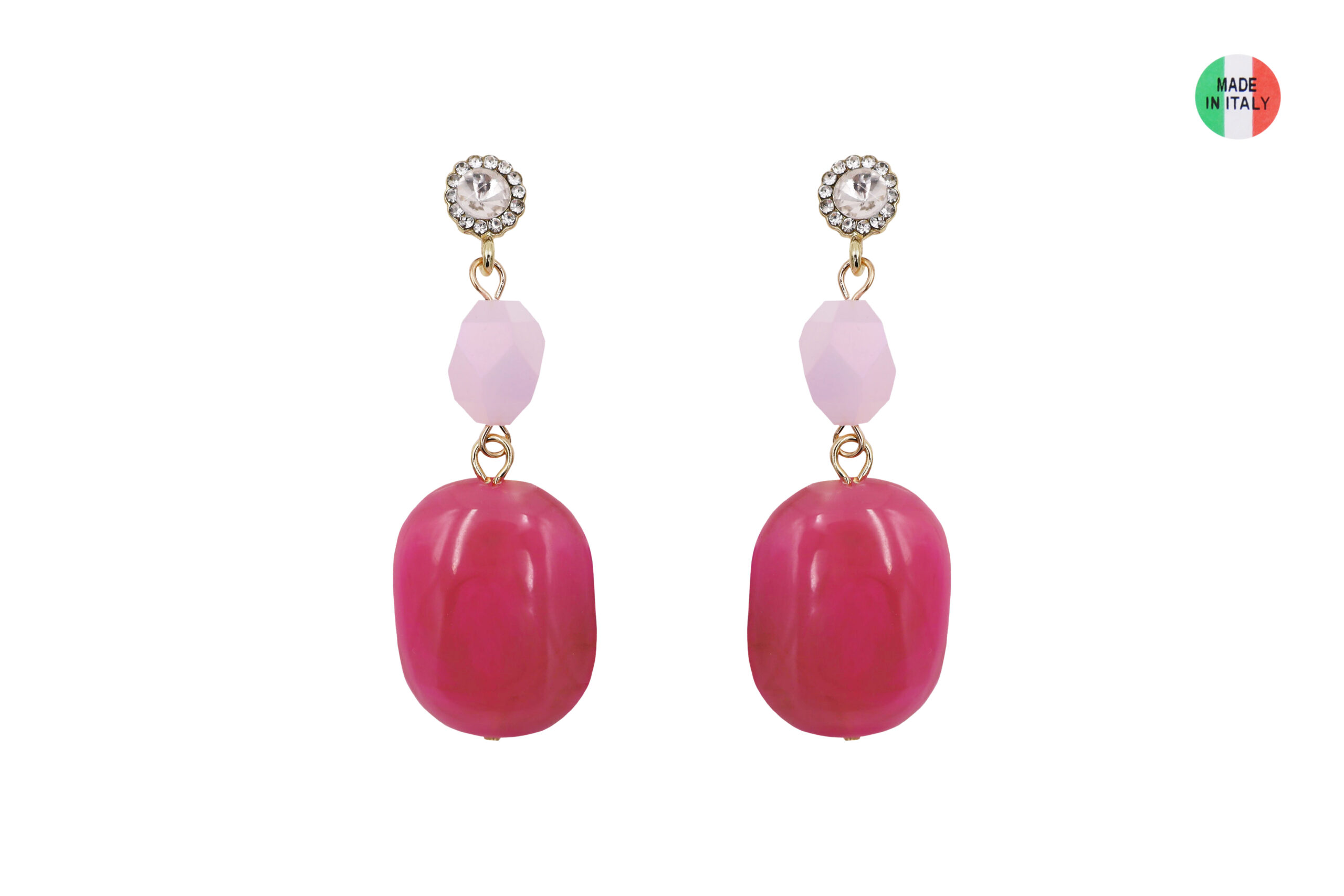 Orecchino perno con pietre in acciaio e resina, disponibile verde o fucsia, lunghezza 6 cm, sacchetto in organza incluso