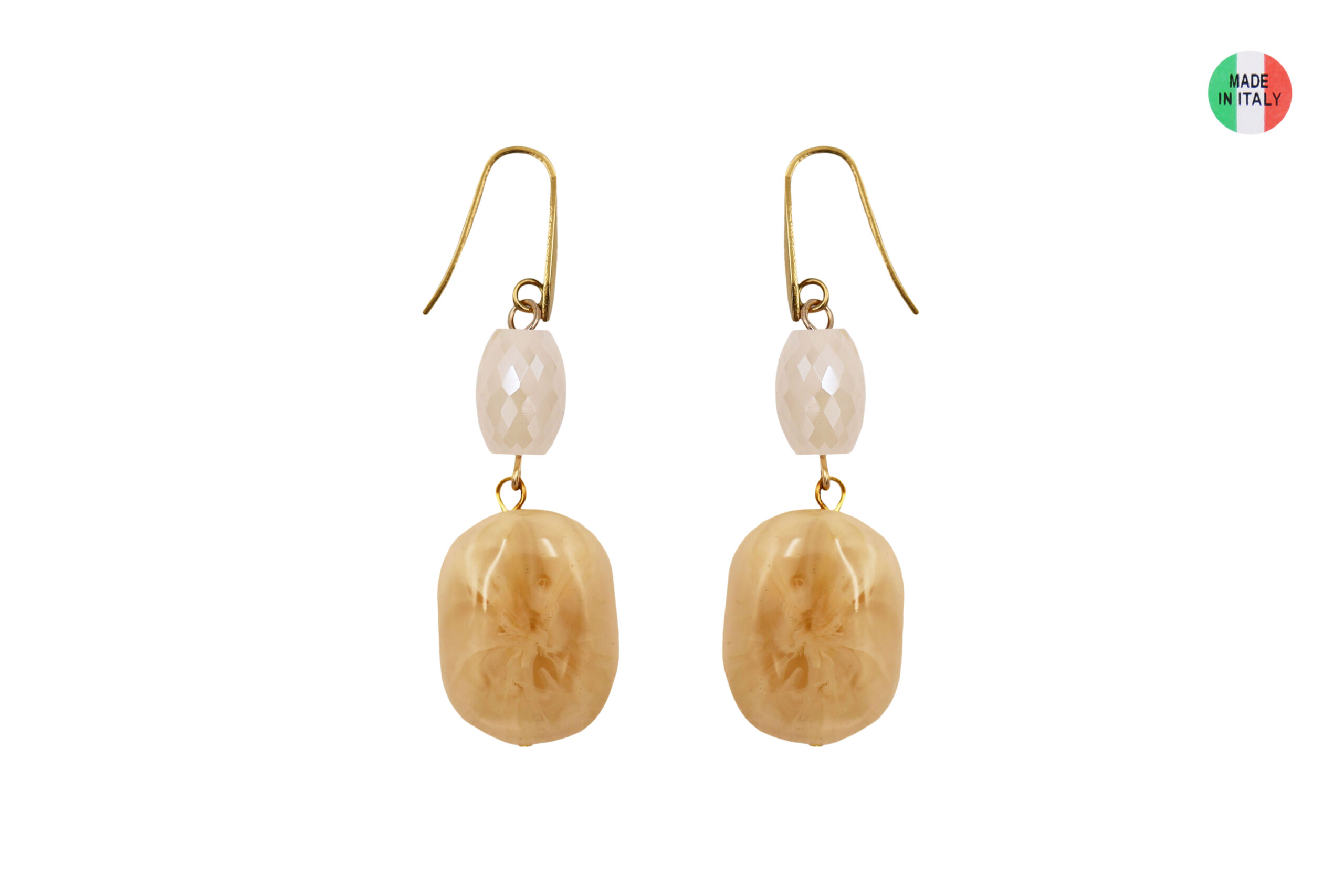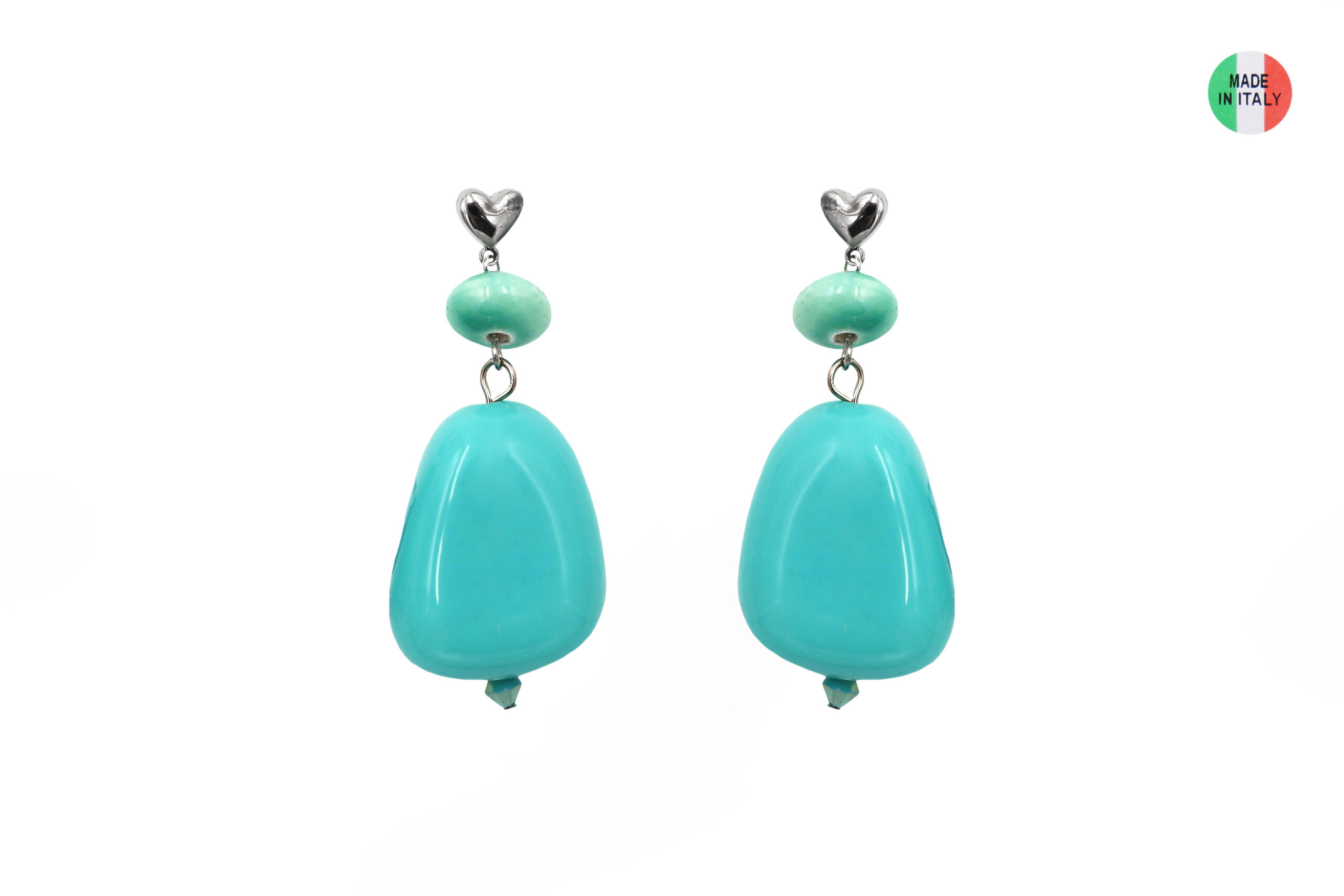 Orecchino perno con particolari in acciaio e resina, disponibile azzurro o beige, lunghezza 6 cm, sacchetto in organza incluso