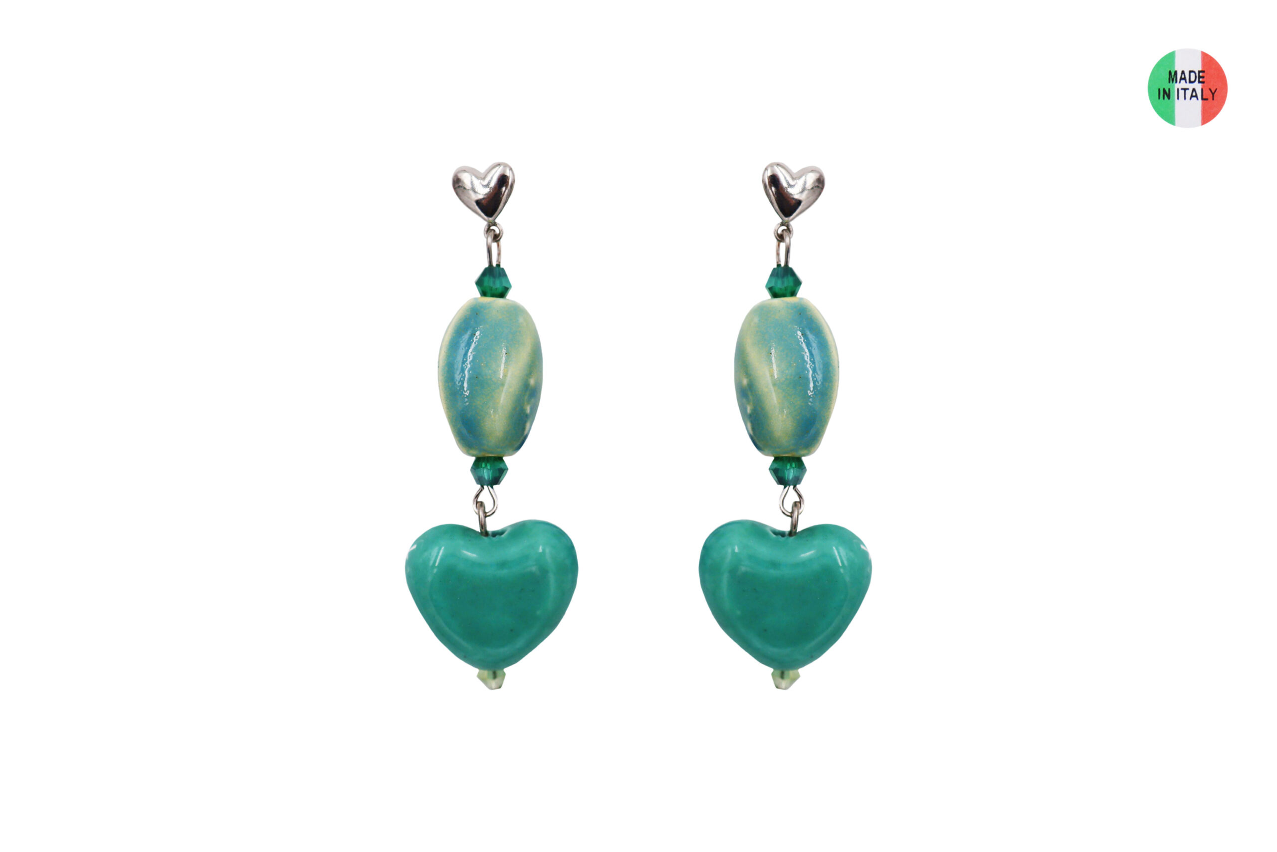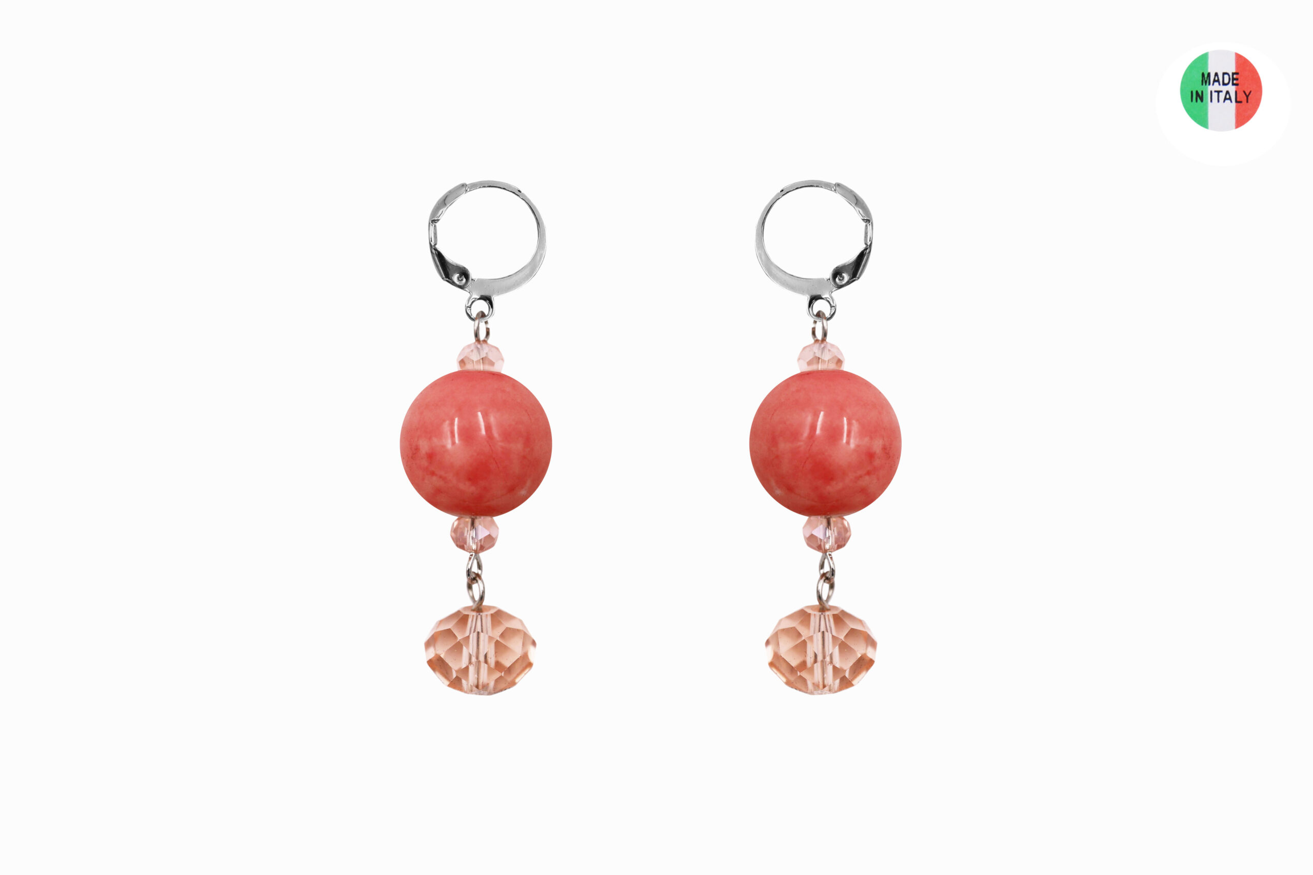 Orecchino cerchio con sfere in acciaio, vetro e resina, disponibile corallo o verde, lunghezza 5,5 cm, sacchetto in organza incluso