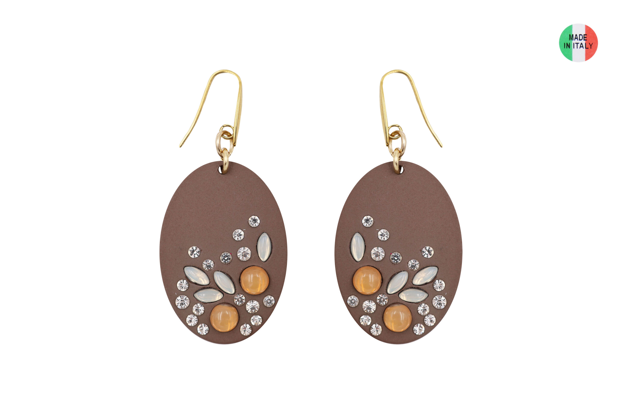 Orecchino amo con ovale in acciaio, plastica e cristallo, disponibile marrone, fucsia o bianco, lunghezza 6 cm, sacchetto in organza incluso