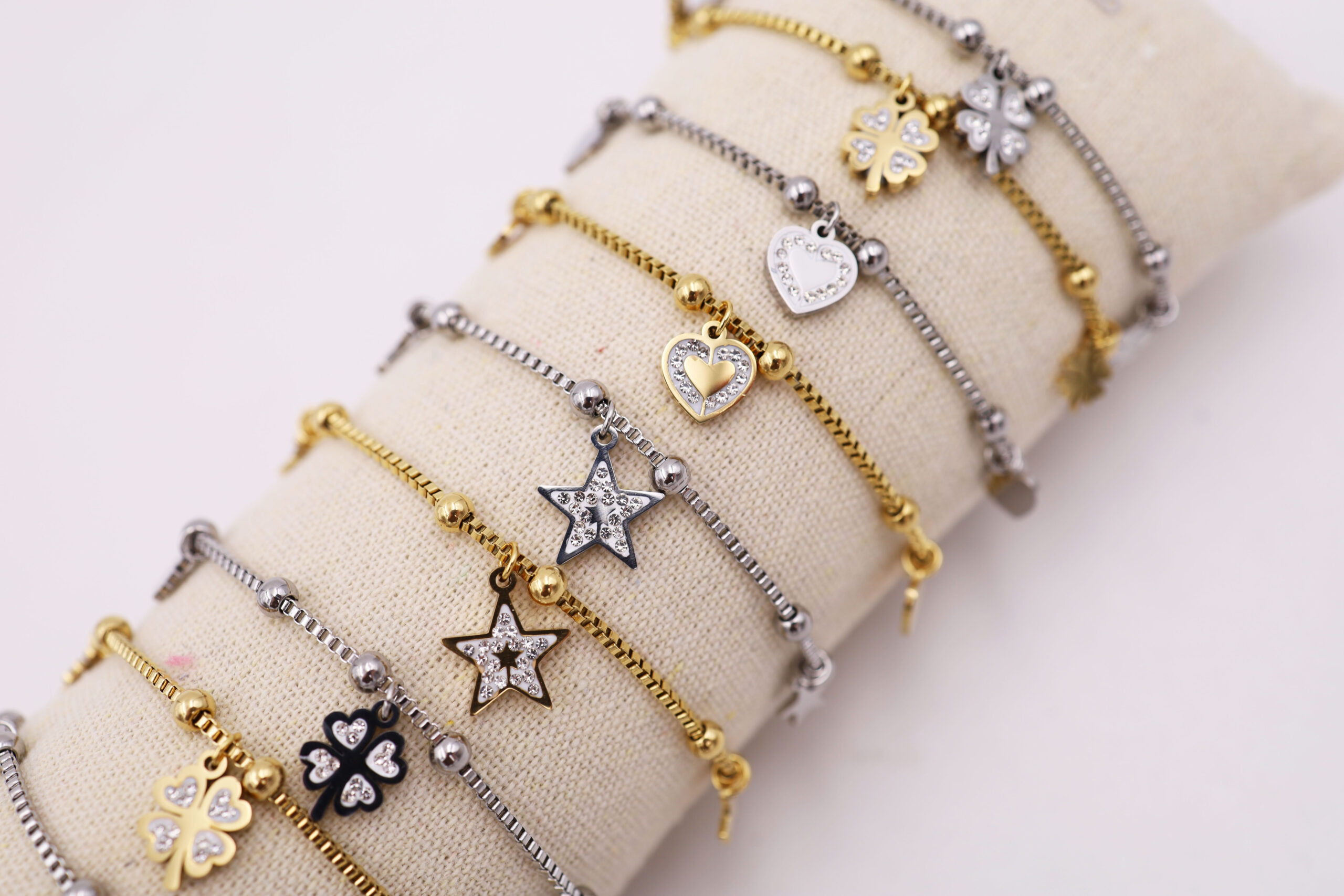 Bracciale in acciaio e particolari con strass su tubo, confezione 12 pezzi modelli assortiti, sacchetto in organza incluso