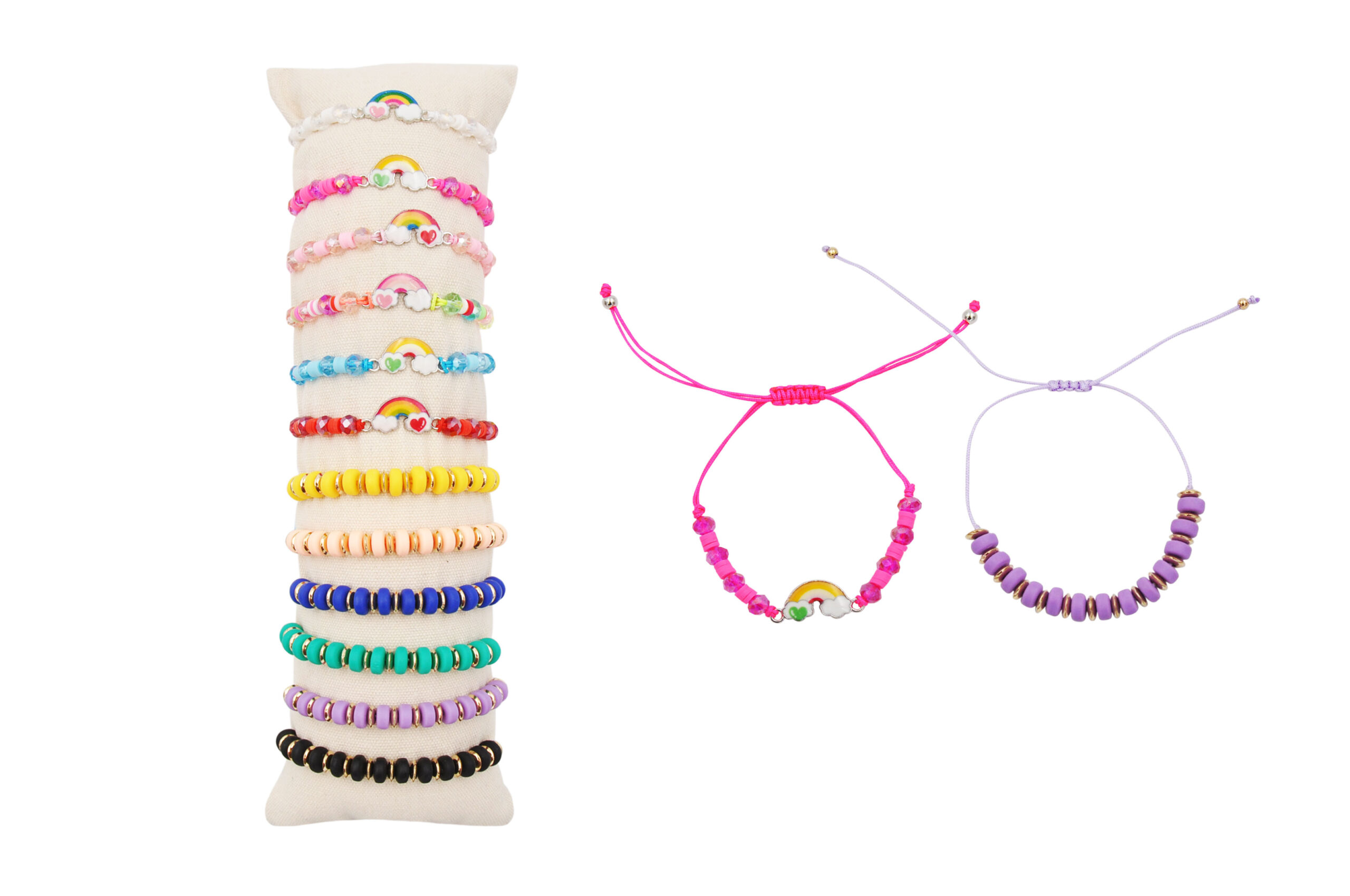 Bracciale regolabile con perline colorate in acciaio, vetro e tessuto sintetico su tubo, confezione 12 pezzi modelli e colori assortiti, sacchetto in organza incluso