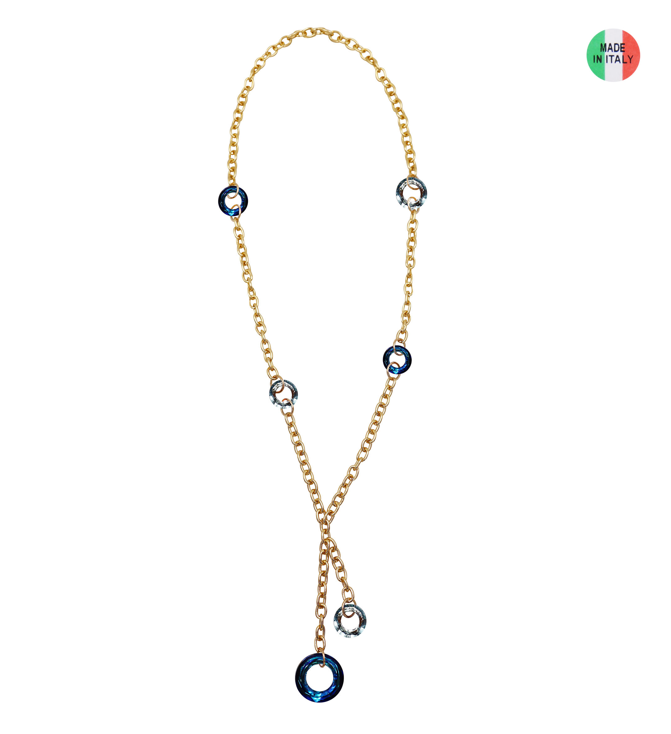 Collana catena con cristalli in metallo e vetro, disponibile oro/azzurro, oro/beige, oro/viola, rodio/azzurro, rodio/beige e rodio/viola, lunghezza 114 cm, sacchetto in organza incluso