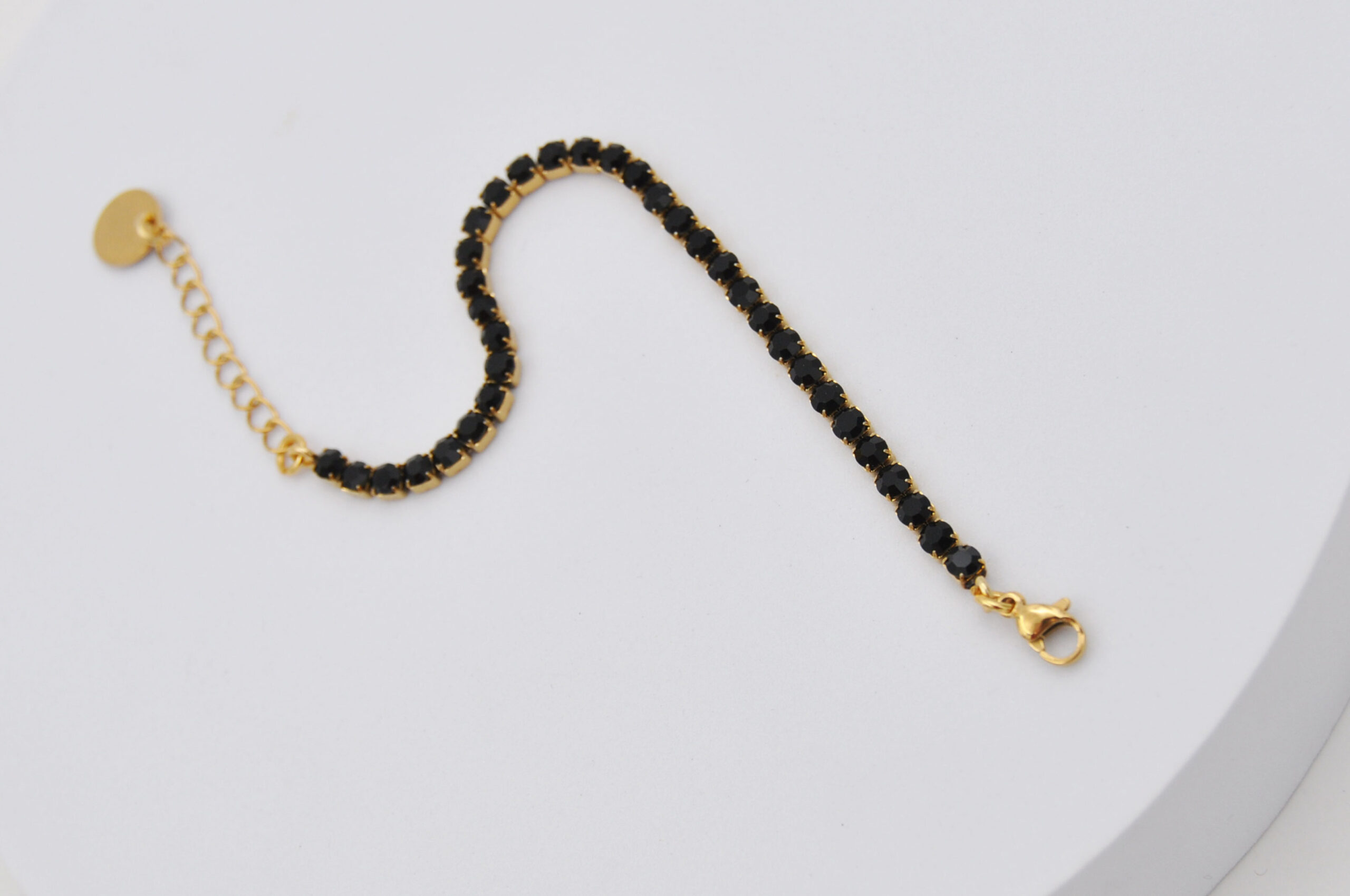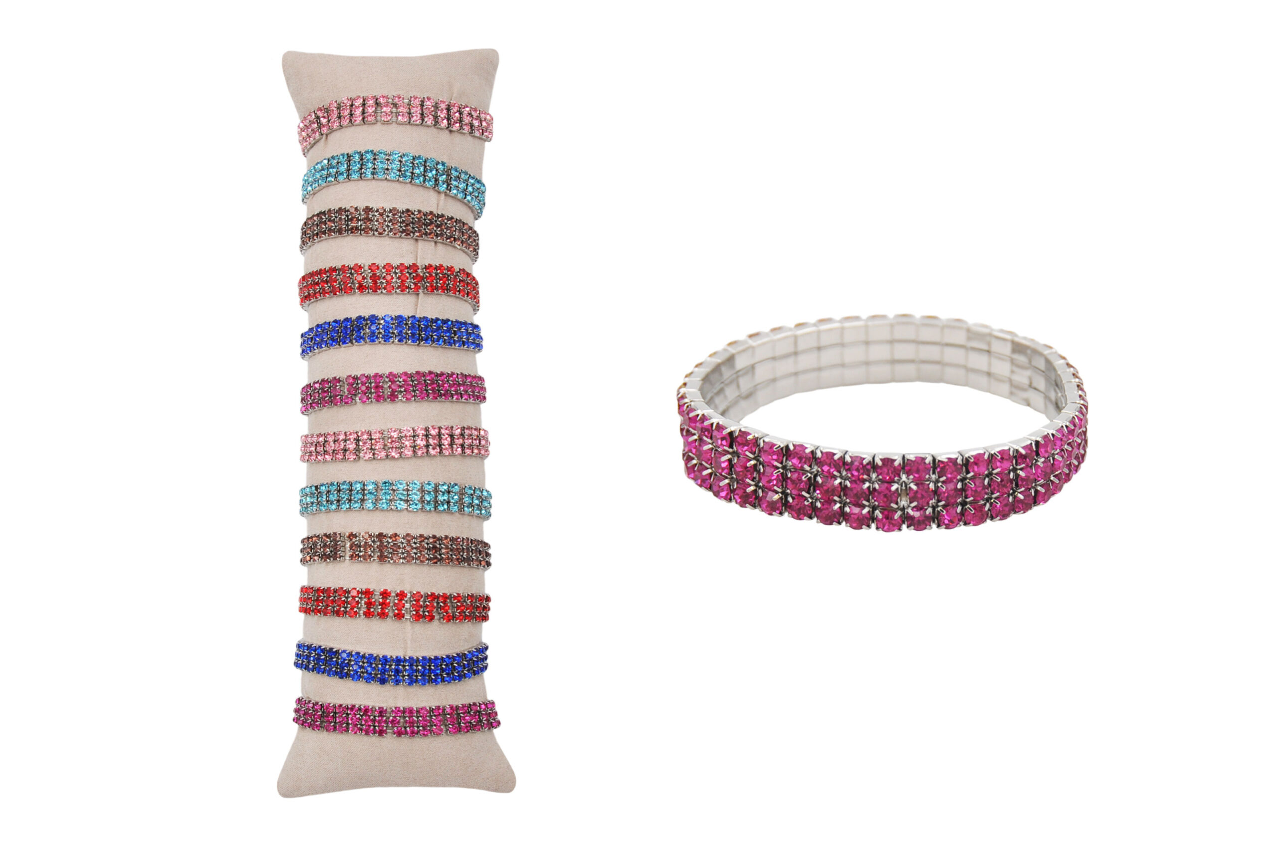 Bracciale elastico tre fili strass in metallo e vetro su tubo, confezione 12 pezzi colori assortiti, sacchetto in organza incluso