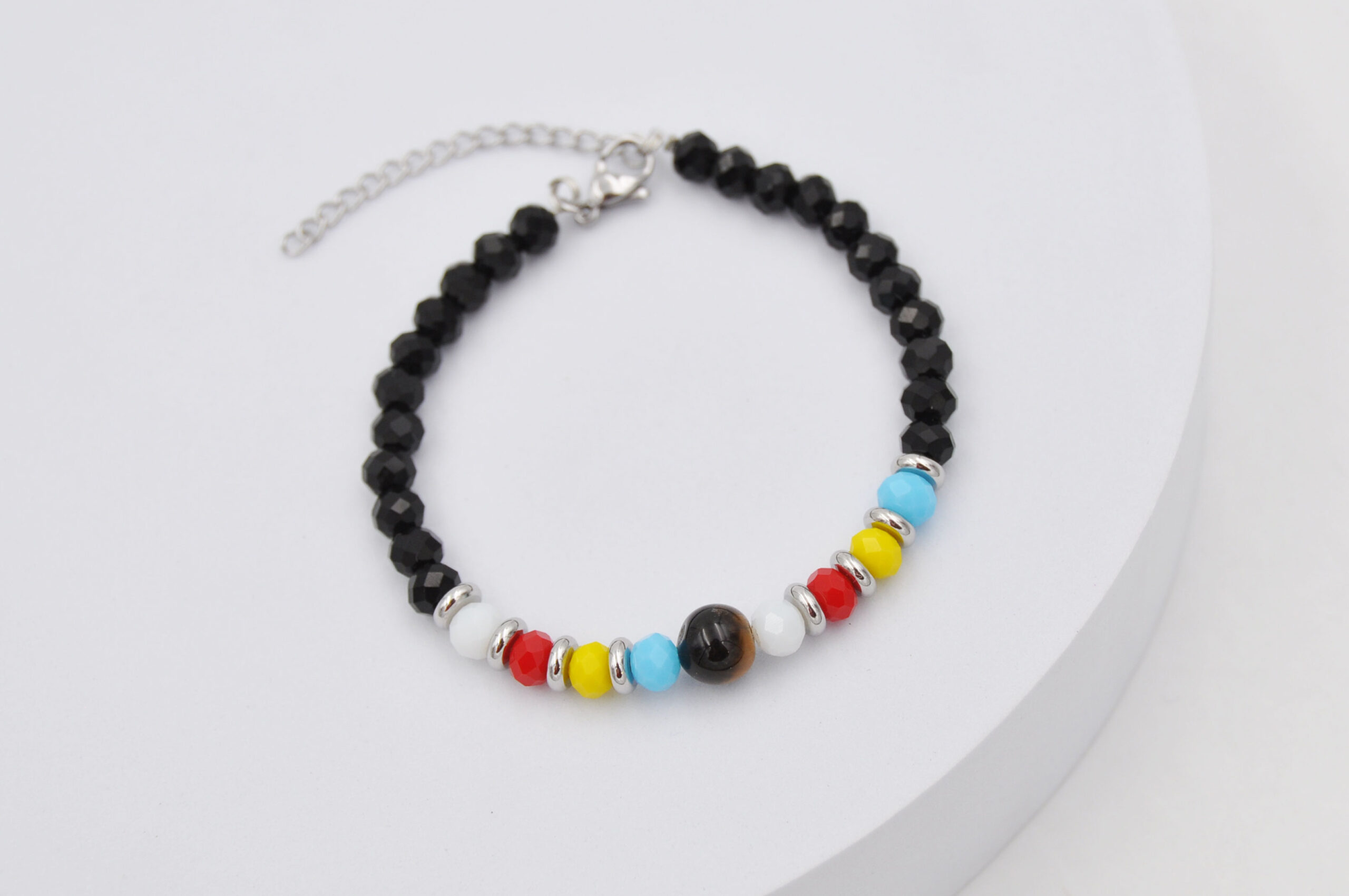 Bracciale con perline colorate in acciaio e vetro su tubo, confezione 12 pezzi colori assortiti, sacchetto in organza incluso
