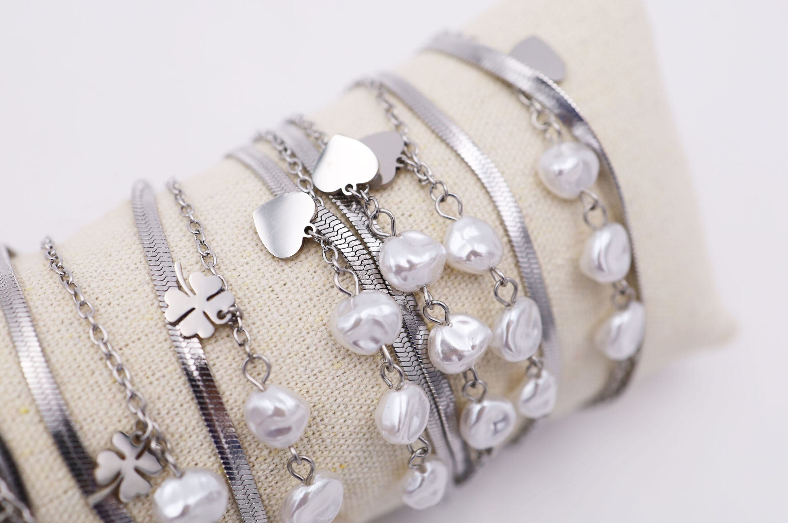 Bracciale doppio filo con perle in acciaio e plastica su tubo, confezione 12 pezzi modelli assortiti, sacchetto in organza incluso
