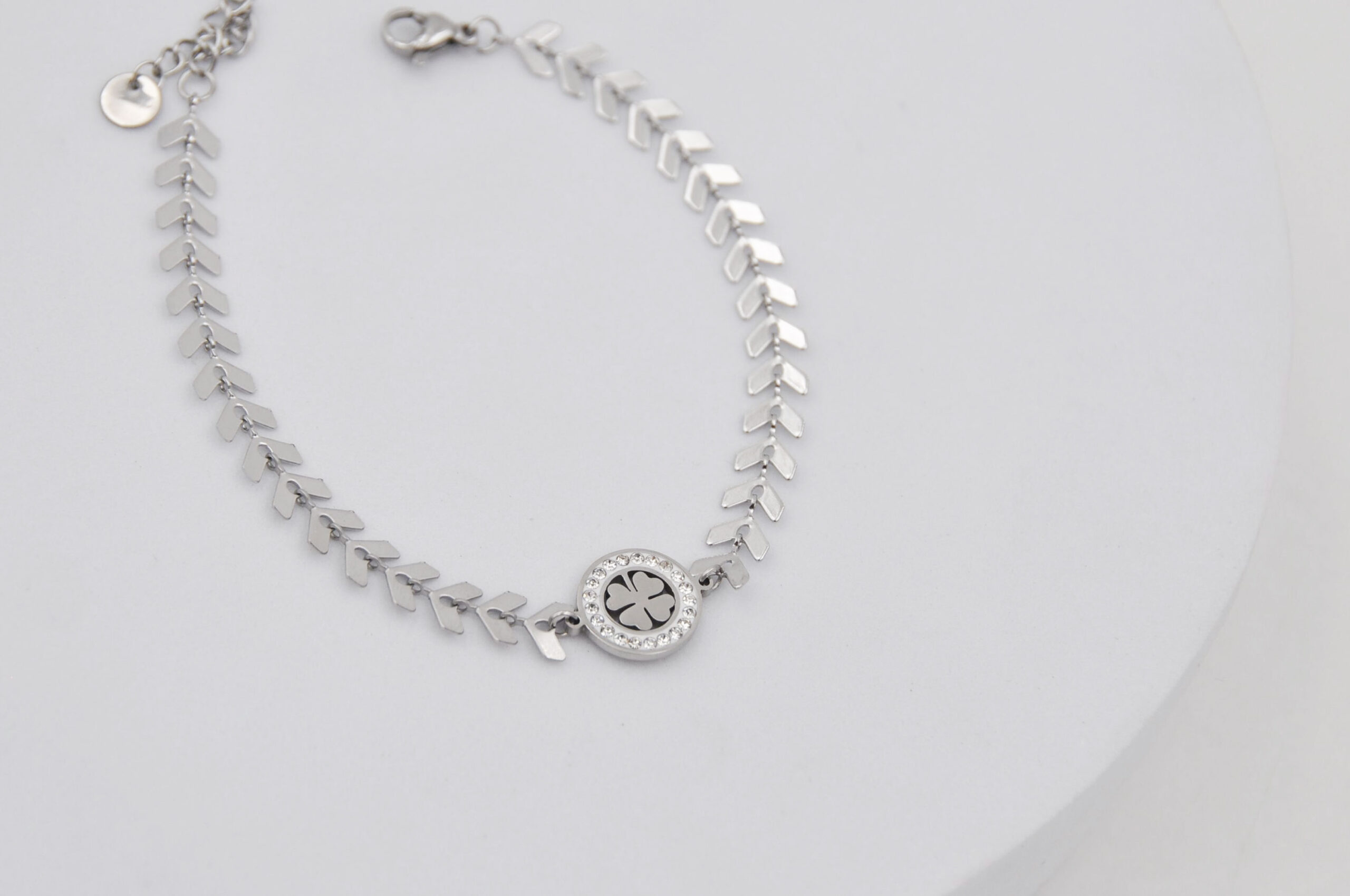Bracciale con tondo strass in acciaio e vetro su tubo, confezione 12 pezzi modelli assortiti, sacchetto in organza incluso