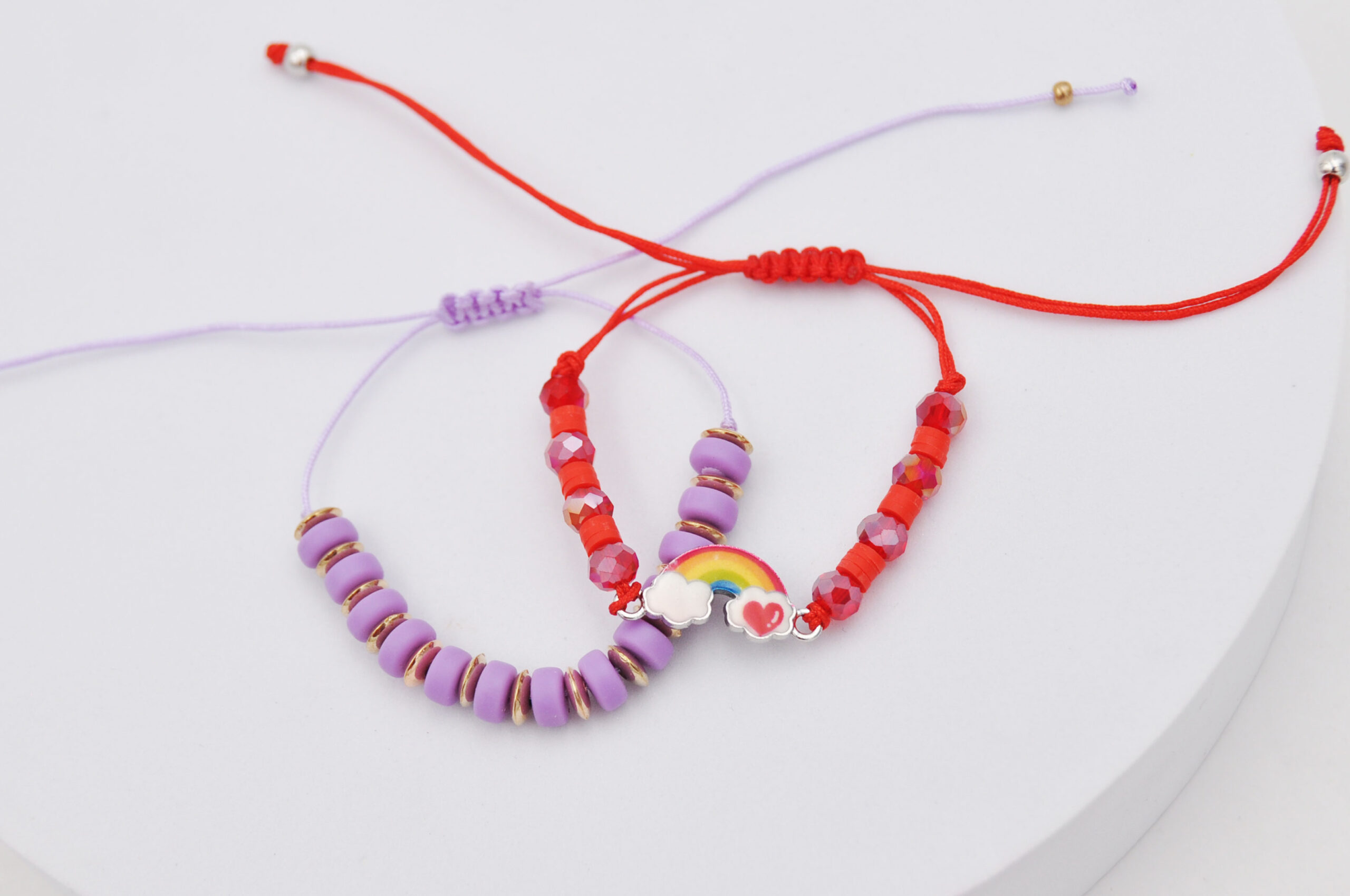 Bracciale regolabile con perline colorate in acciaio, vetro e tessuto sintetico su tubo, confezione 12 pezzi modelli e colori assortiti, sacchetto in organza incluso