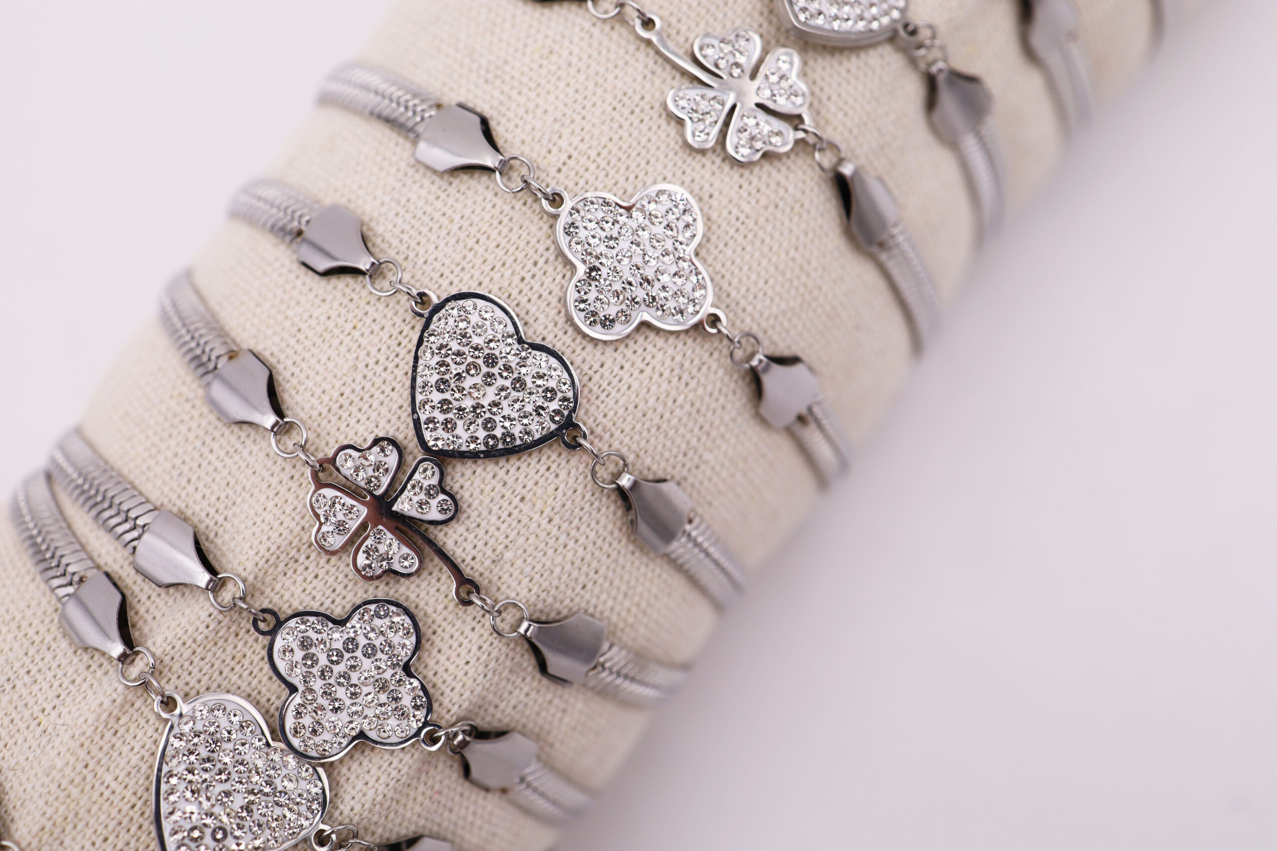 Bracciale in acciaio e particolari con strass su tubo, confezione 12 pezzi modelli assortiti, sacchetto in organza incluso
