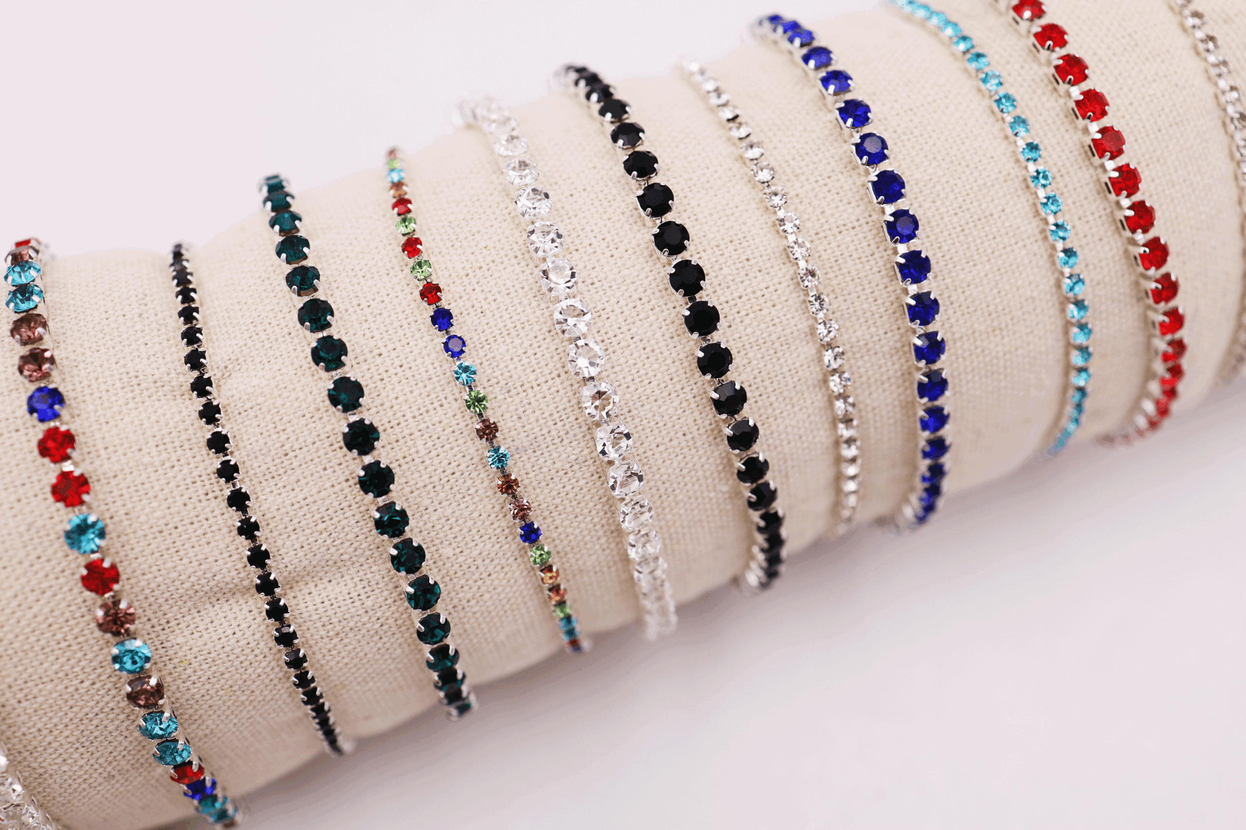 Bracciale catena con strass su tubo, confezione 12 pezzi colori assortiti, sacchetto in organza incluso