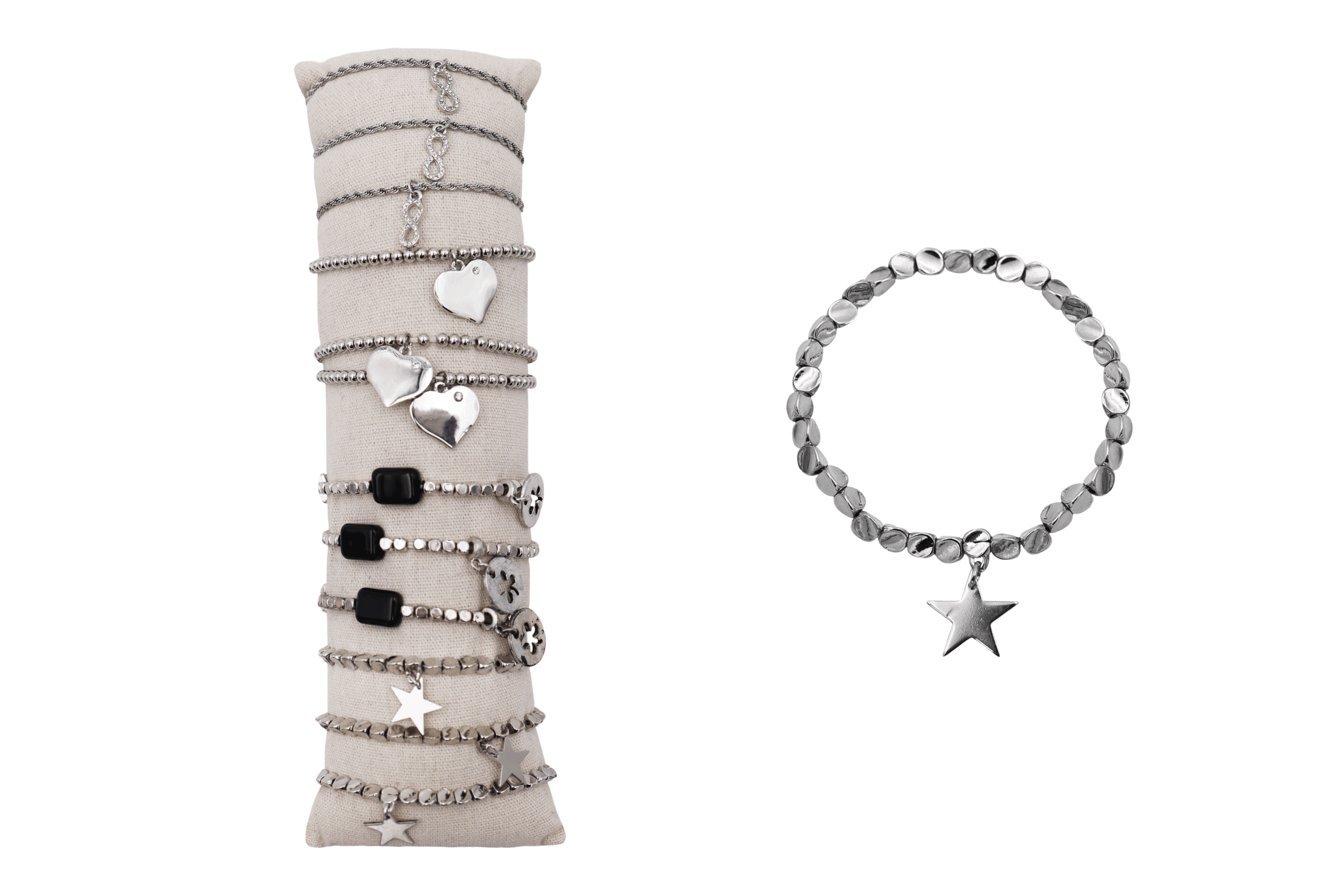 Bracciale con pendenti in metallo e plastica su tubo, confezione 12 pezzi modelli assortiti, sacchetto in organza incluso