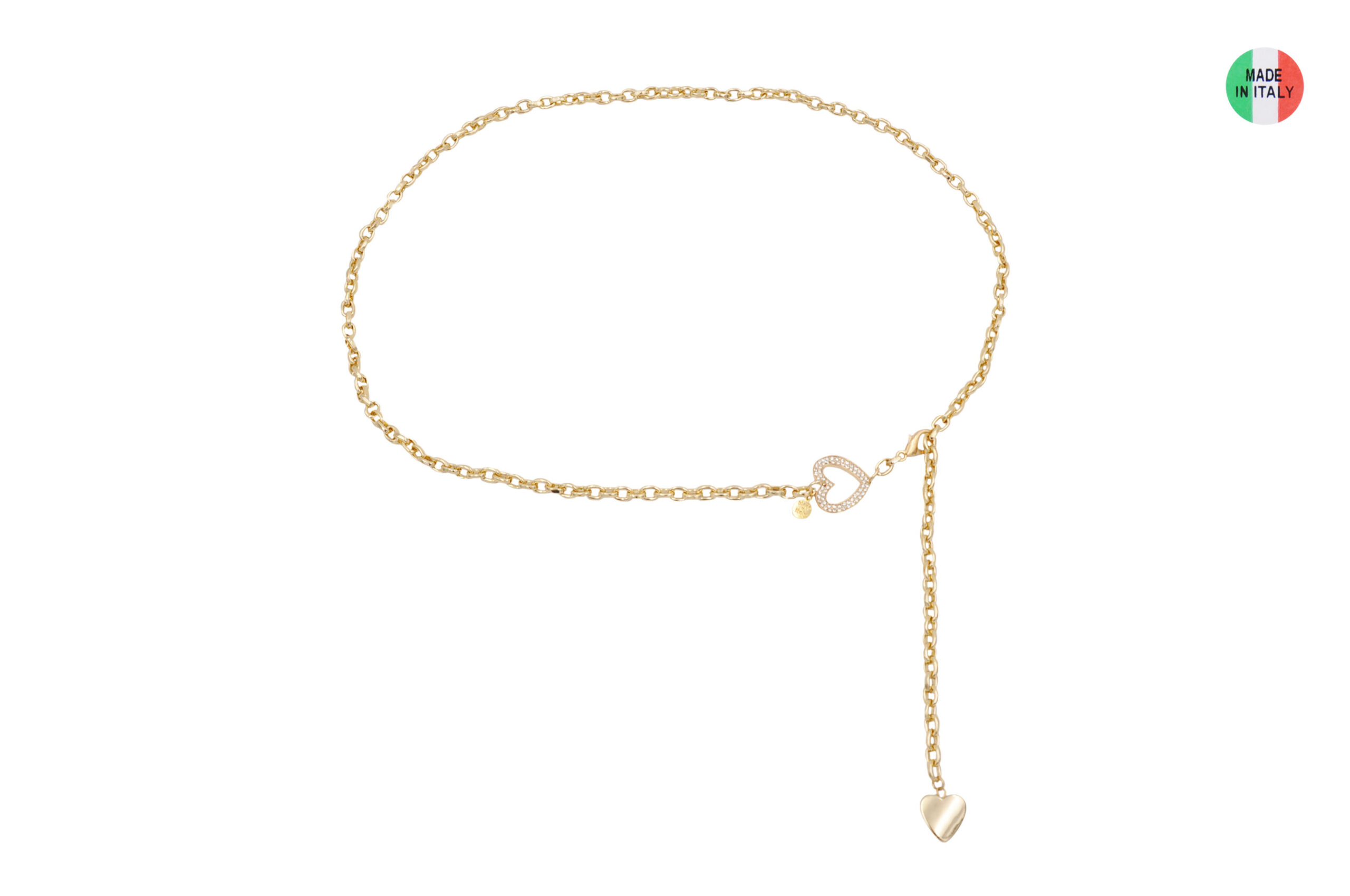 Cintura catena regolabile con cuore strass in alluminio, plastica e vetro, disponibile rodio o oro, sacchetto in organza incluso