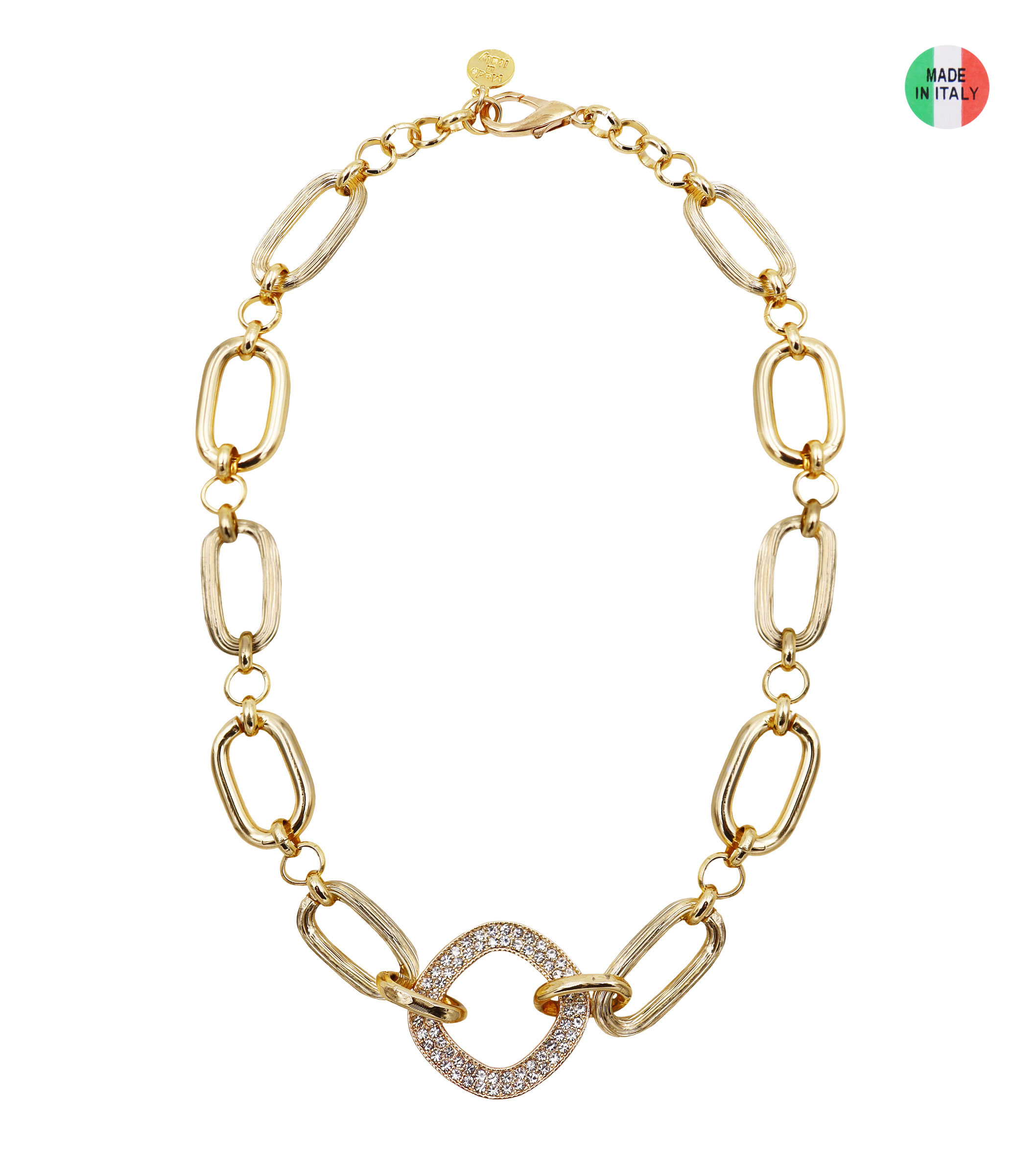 Collana catena con rombo strass in metallo e vetro, disponibile oro o rodio, lunghezza 46 cm, sacchetto in organza incluso