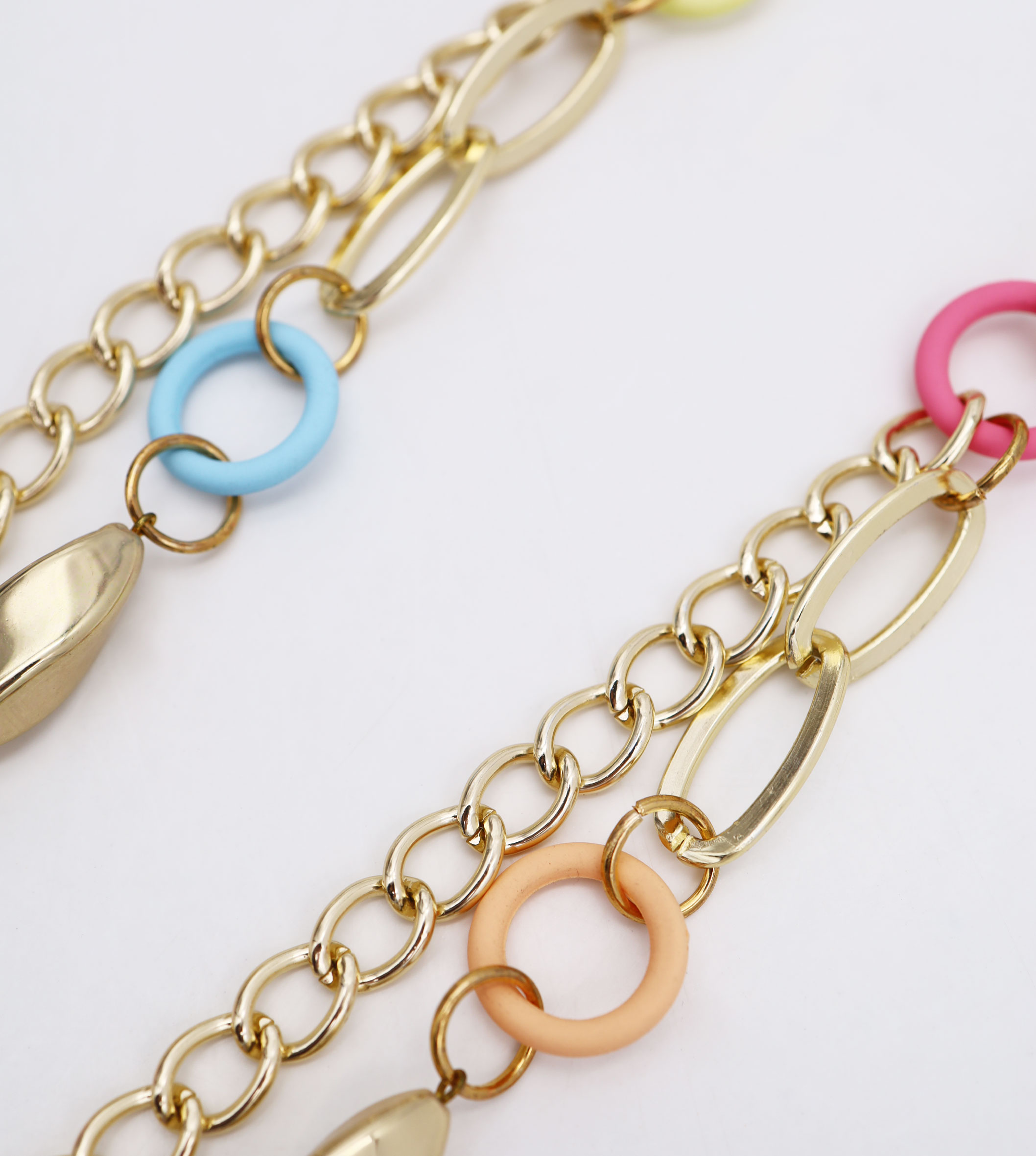 Collana catena multifilo con particolari gommati in plastica e metallo, lunghezza 100 cm, sacchetto in organza incluso