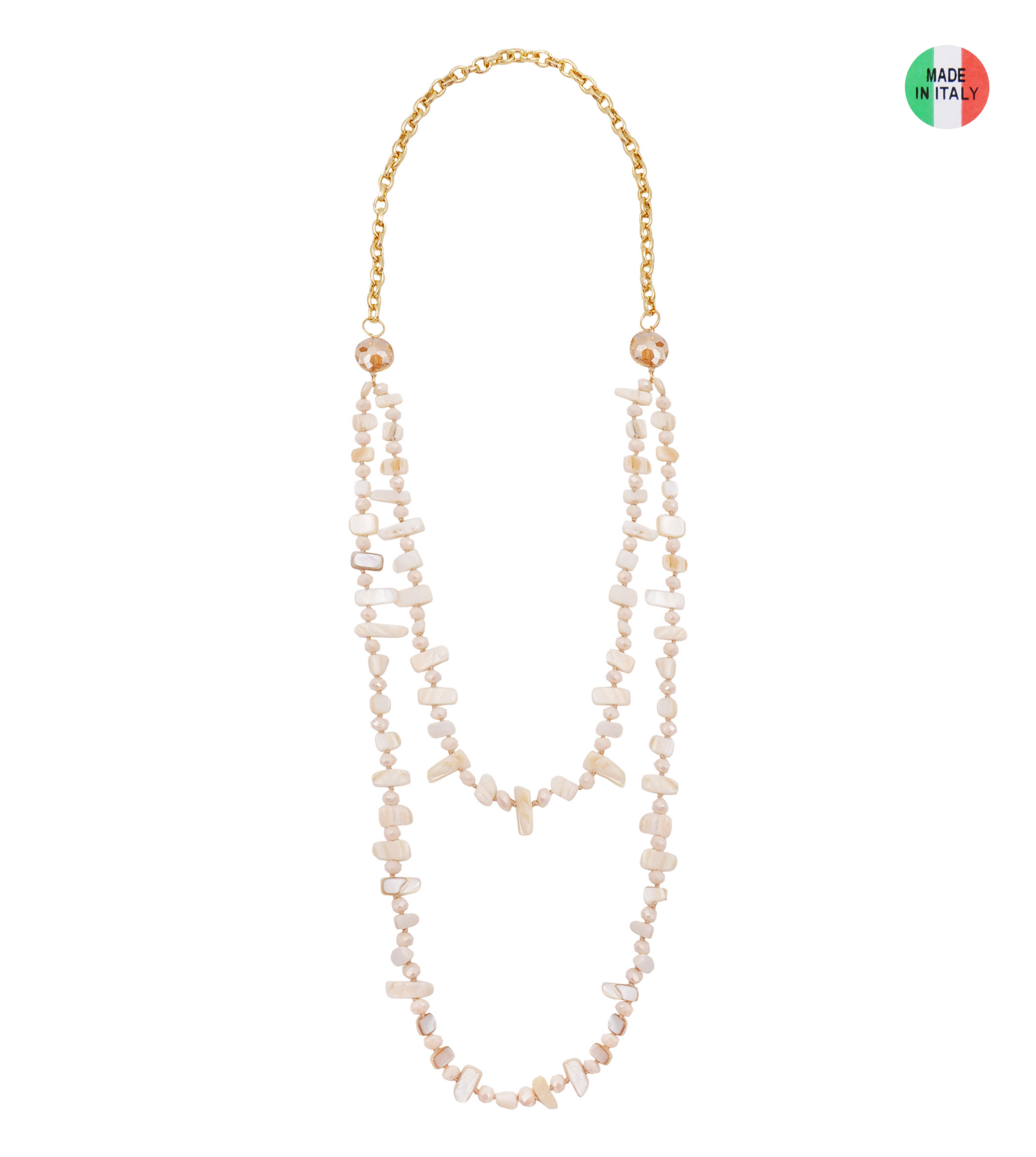 Collana catena con particolari in conchiglia, metallo e tessuto sintetico, disponibile beige, corallo o menta, lunghezza 100 cm, sacchetto in organza incluso