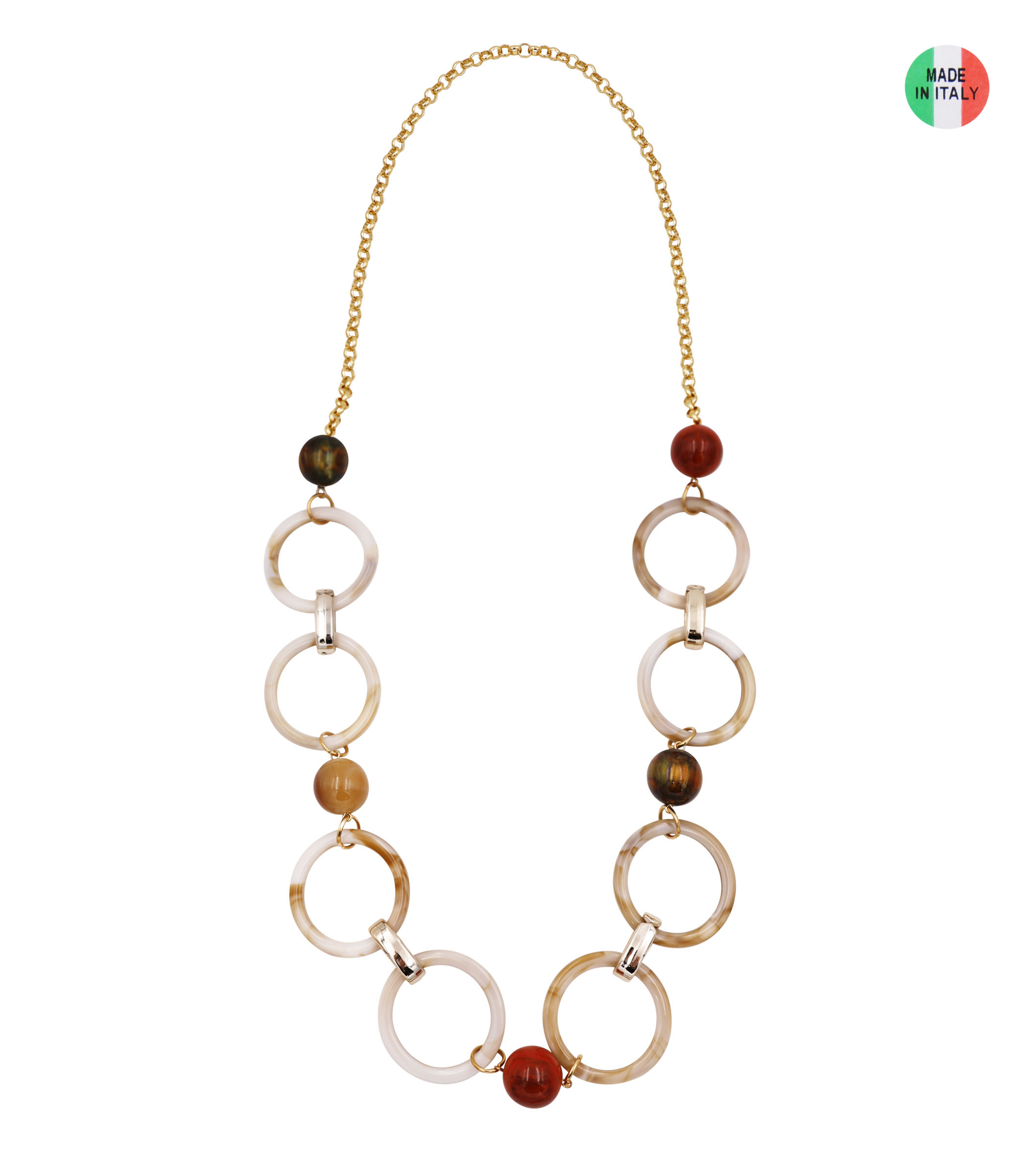 Collana catena con tondi e particolari in resina e metallo, lunghezza 96 cm, sacchetto in organza incluso