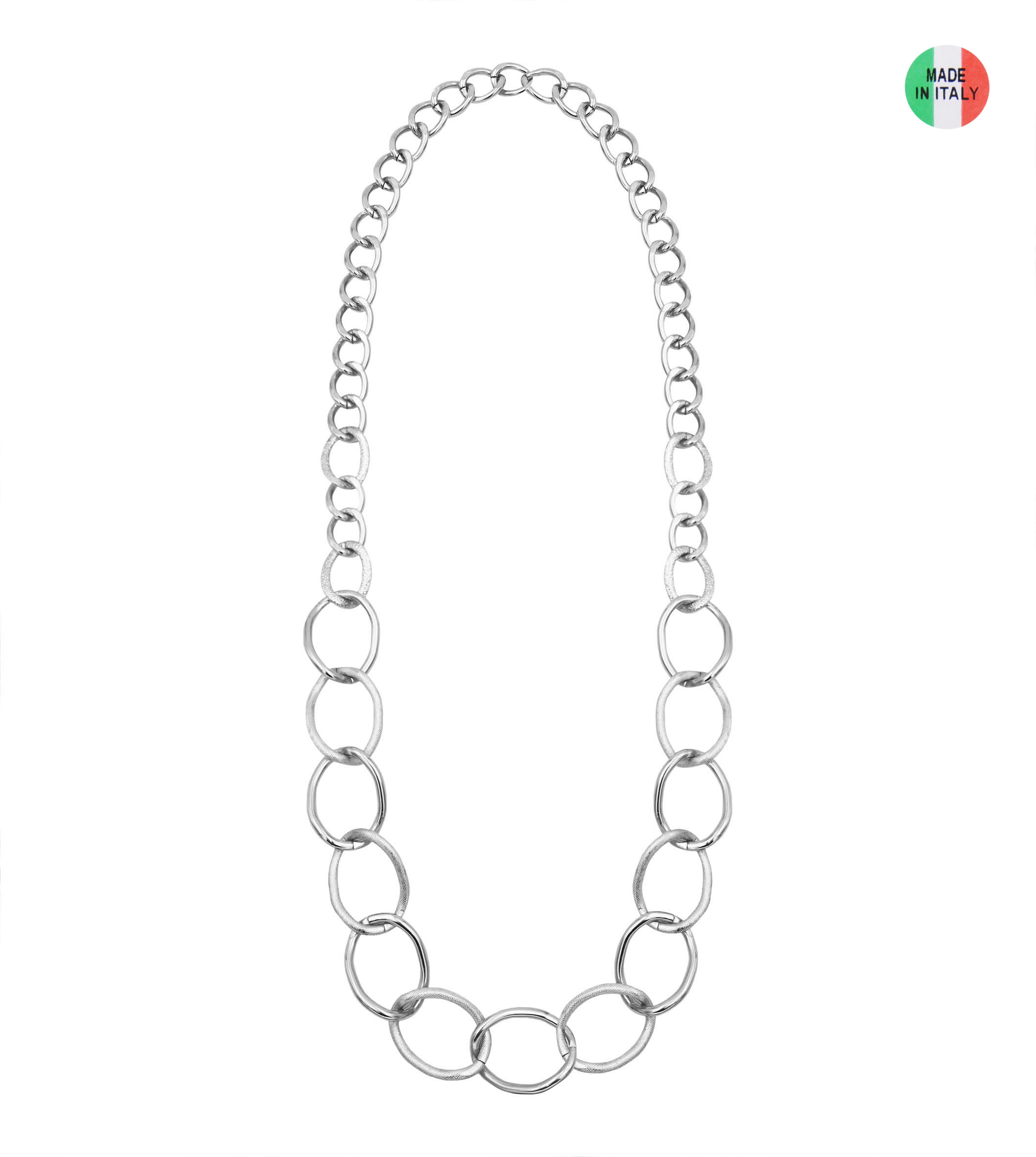 Collana catena in metallo, disponibile oro o rodio, lunghezza 96 cm, sacchetto in organza incluso