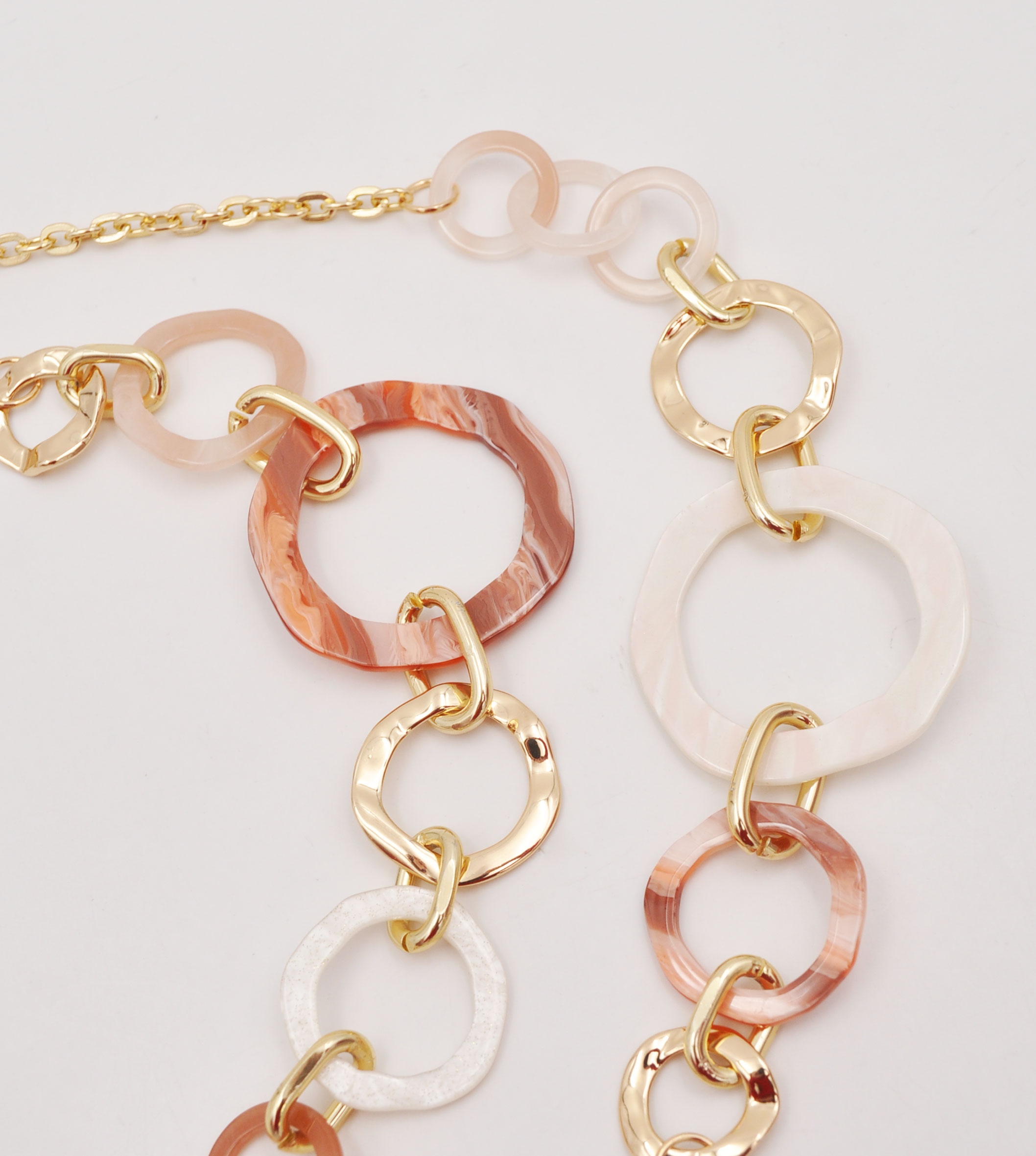 Collana catena con tondi e particolari in resina e metallo, lunghezza 96 cm, sacchetto in organza incluso