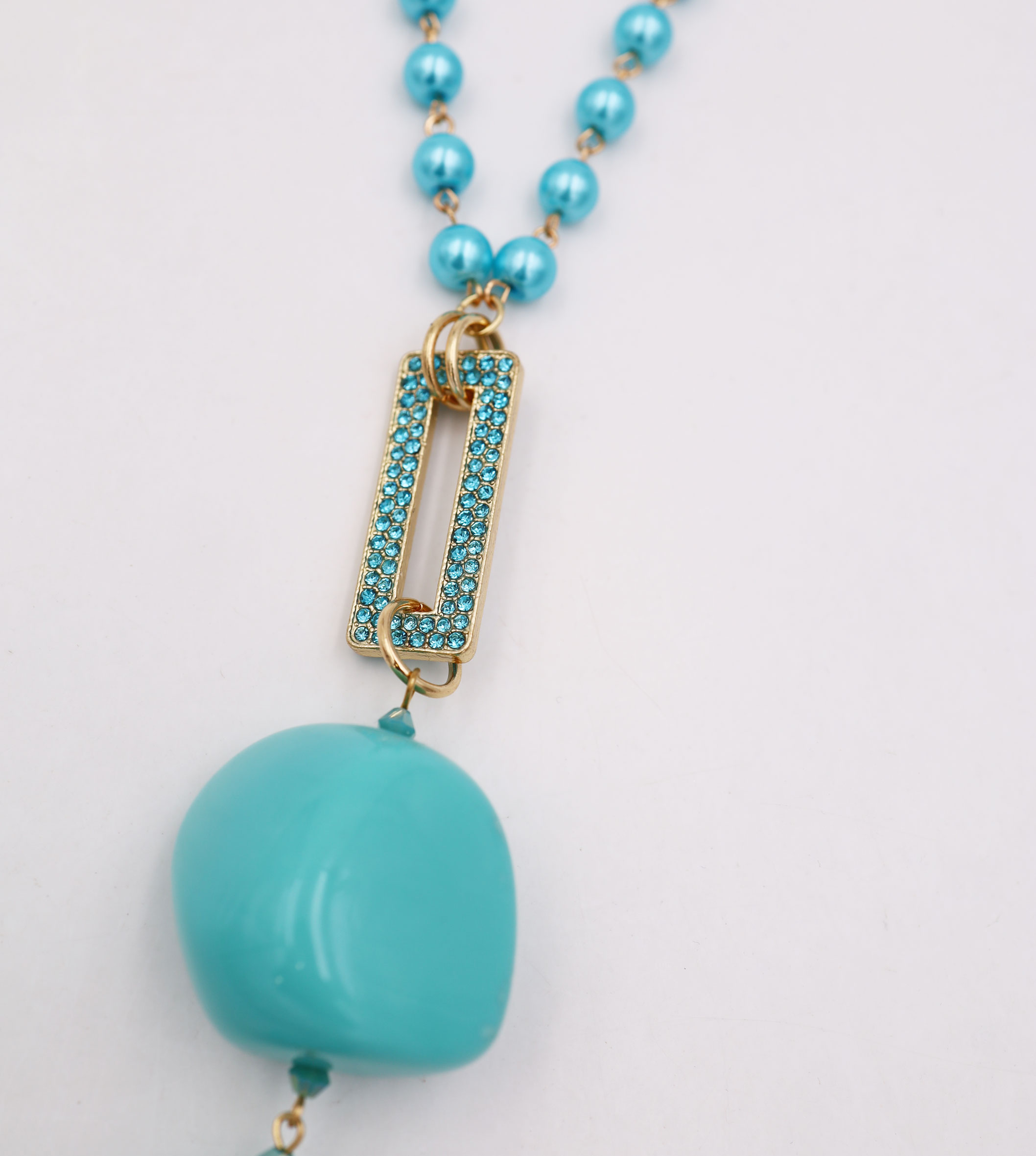 Collana perle con particolari oro in vetro, metallo e plastica, disponibile azzurro o rosa, lunghezza 100 cm, sacchetto in organza incluso