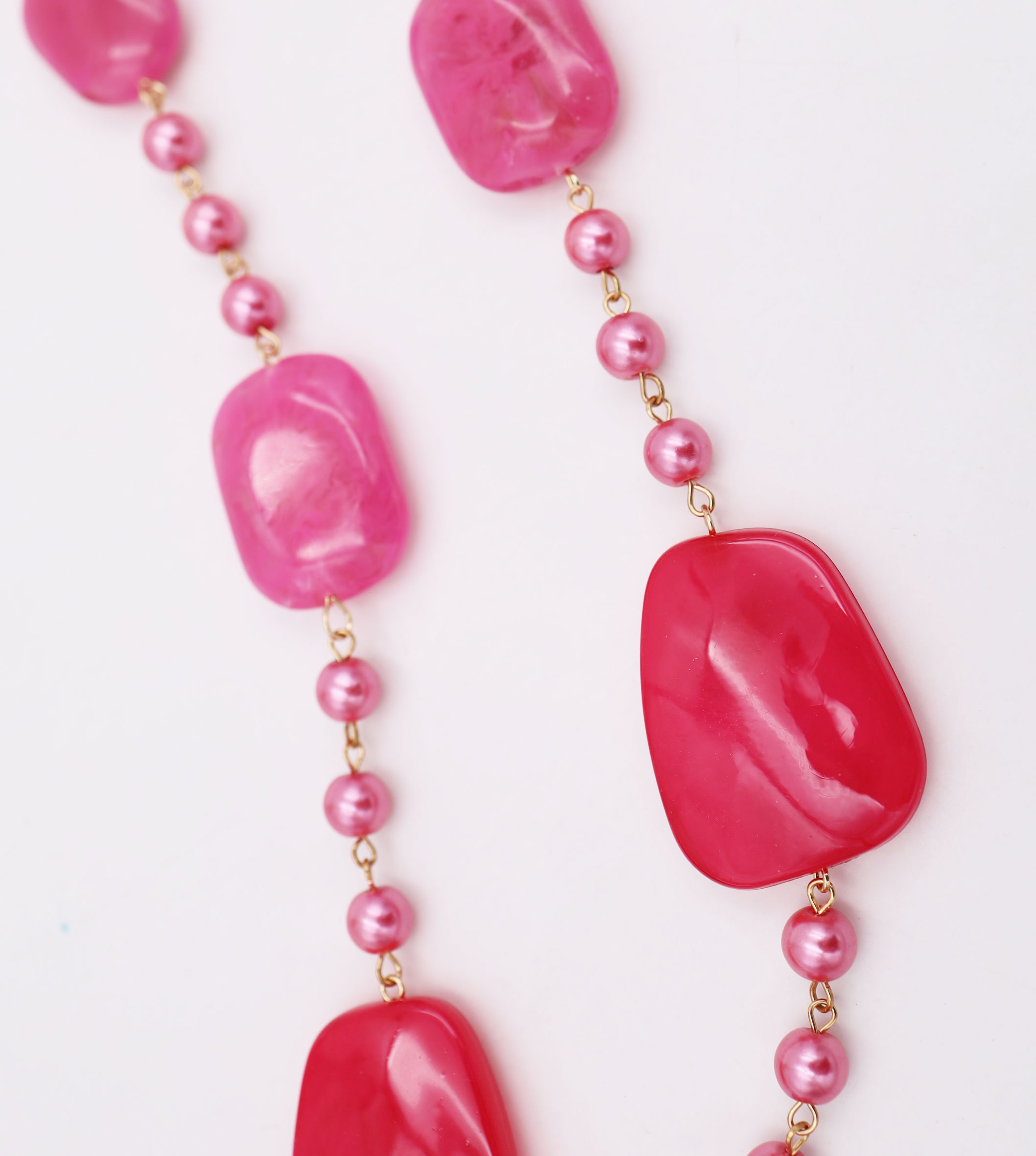 Collana catena e perle con particolari in vetro, metallo e plastica, lunghezza 100 cm, sacchetto in organza incluso