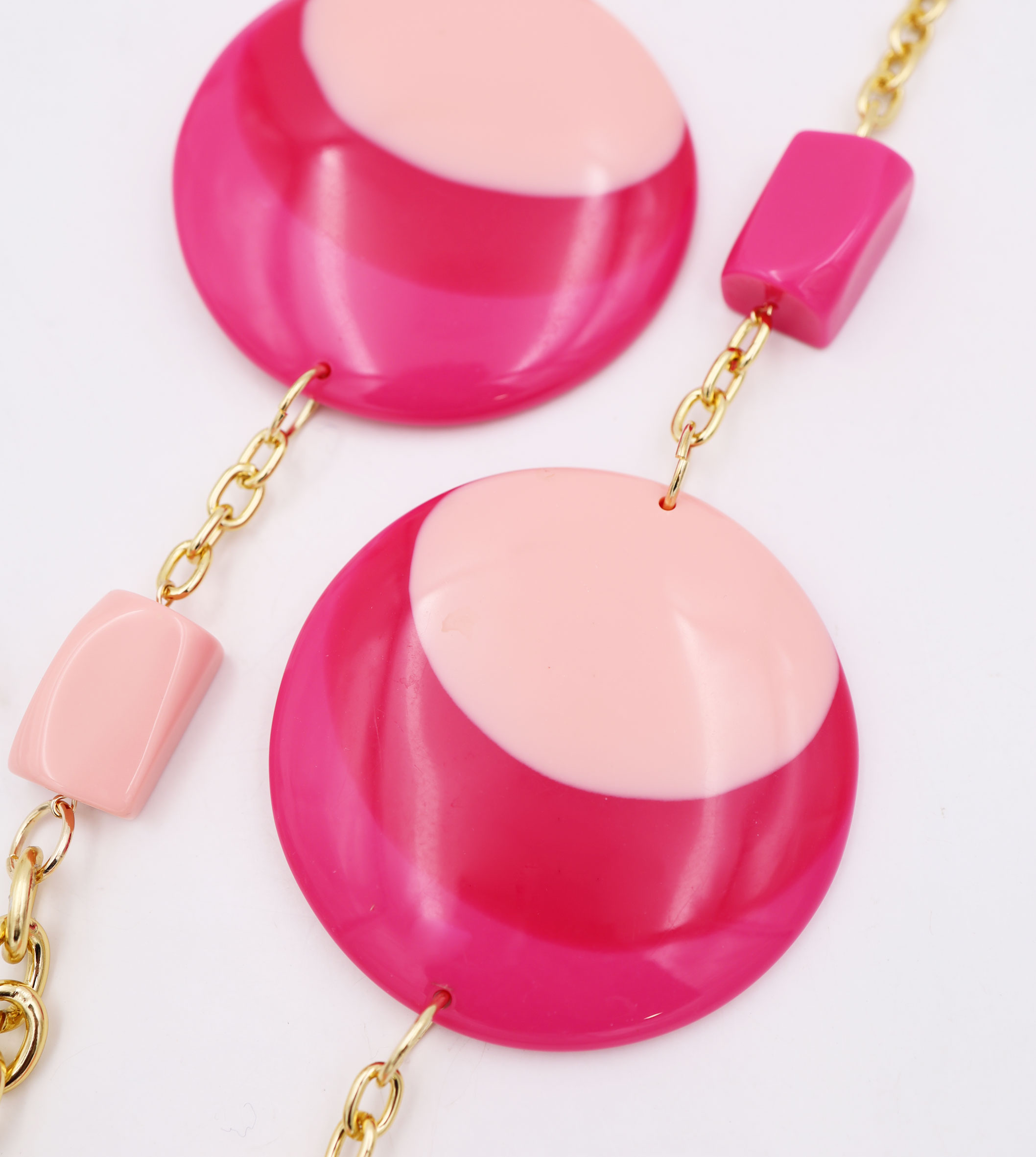 Collana catena con tondi in plastica e metallo, lunghezza 100 cm, sacchetto in organza incluso
