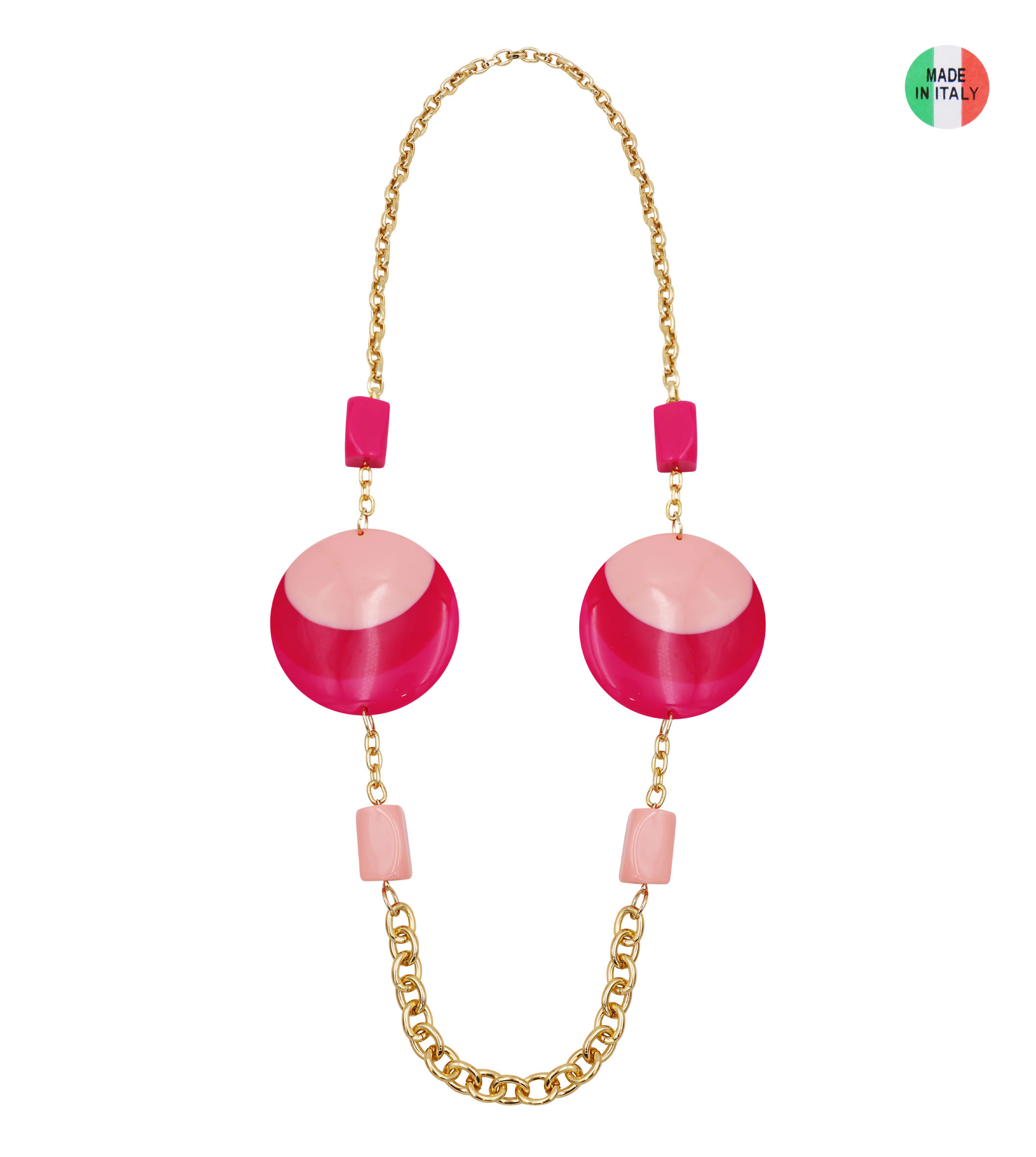 Collana catena con tondi in plastica e metallo, lunghezza 100 cm, sacchetto in organza incluso