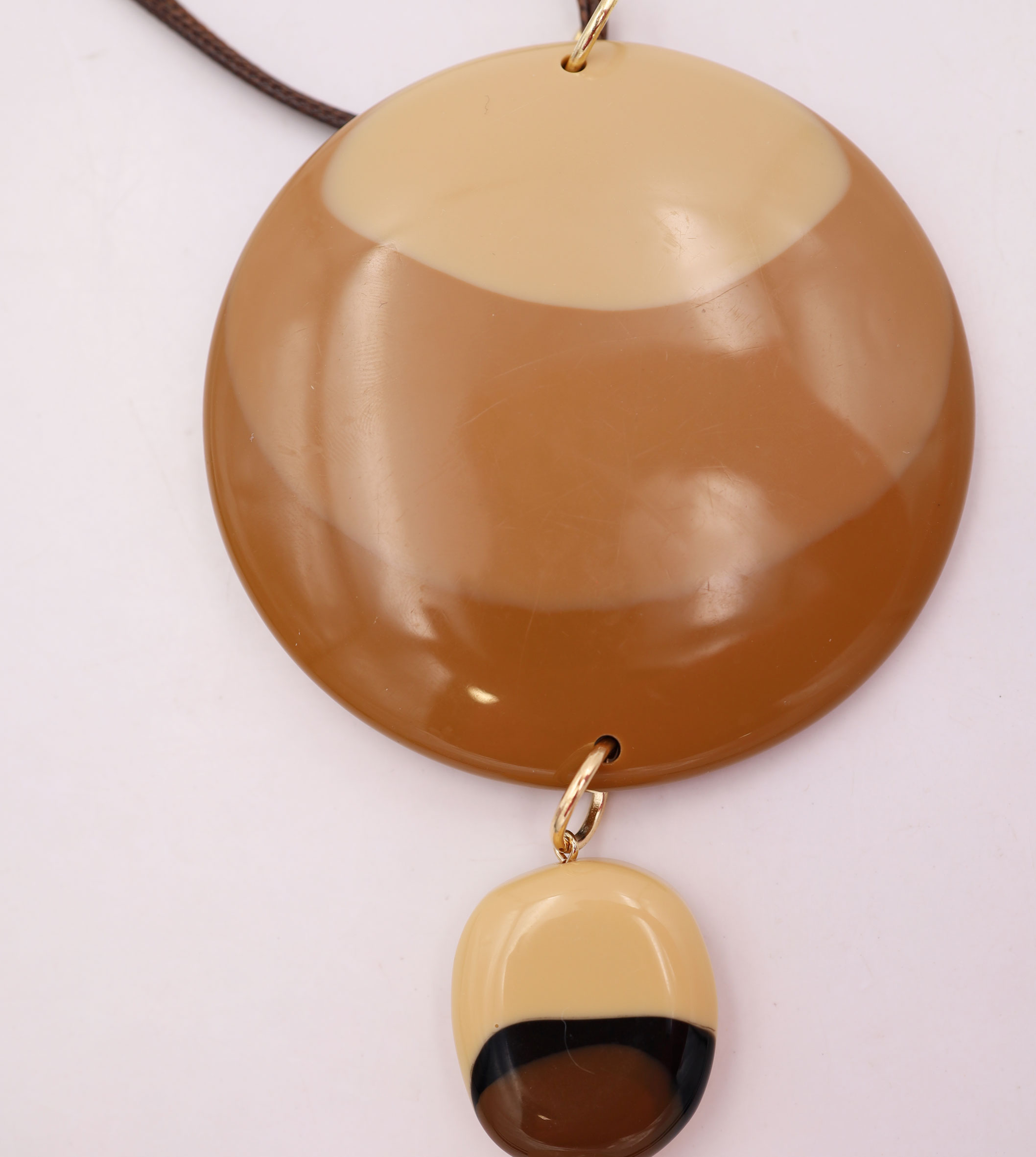 Collana corda con tondo centrale in metallo, plastica e tessuto sintetico, lunghezza 76 cm, sacchetto in organza incluso