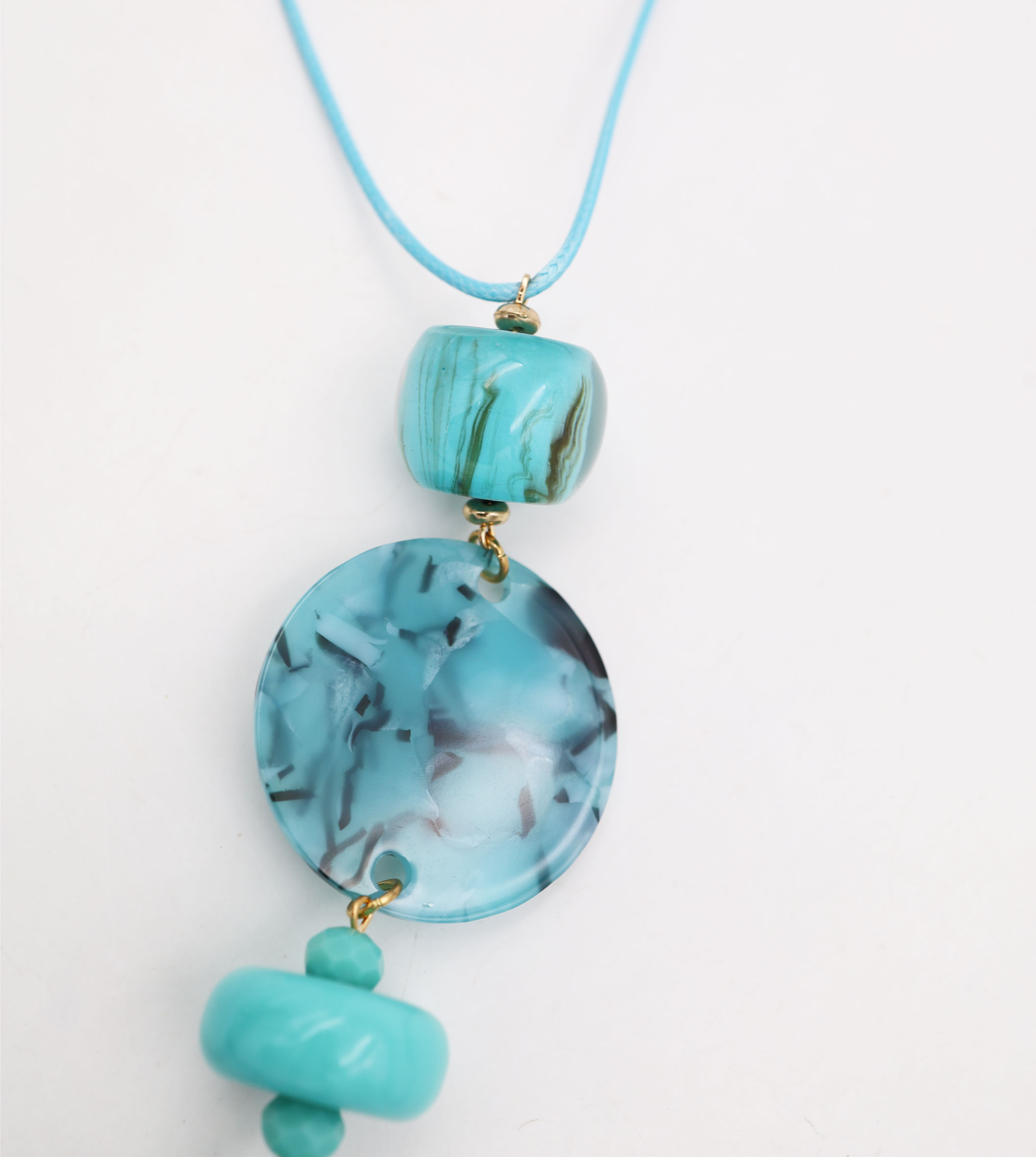 Collana catena con particolari in metallo e plastica, disponibile tono marrone o tono azzurro, lunghezza 82 cm, sacchetto in organza incluso