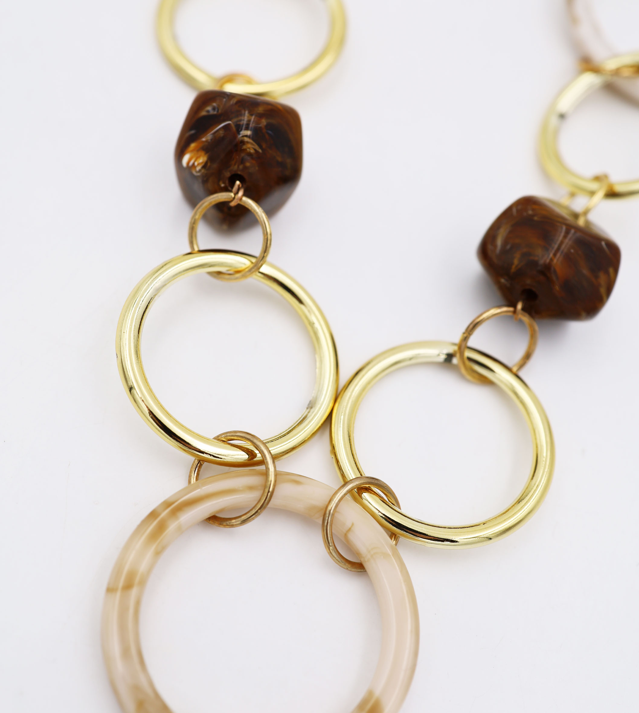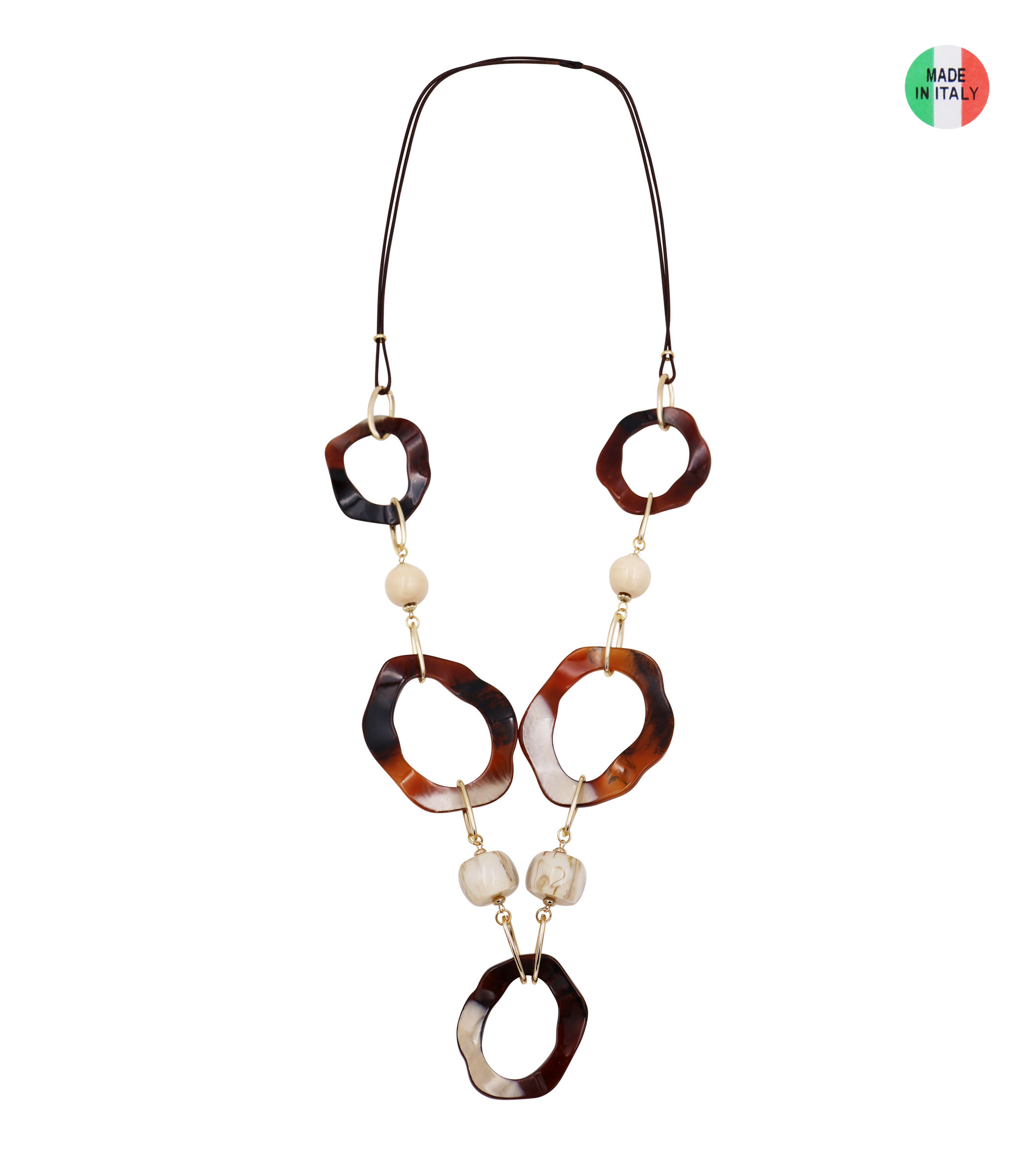 Collana con cerchi e particolari in metallo e resina, lunghezza 100 cm, sacchetto in organza incluso