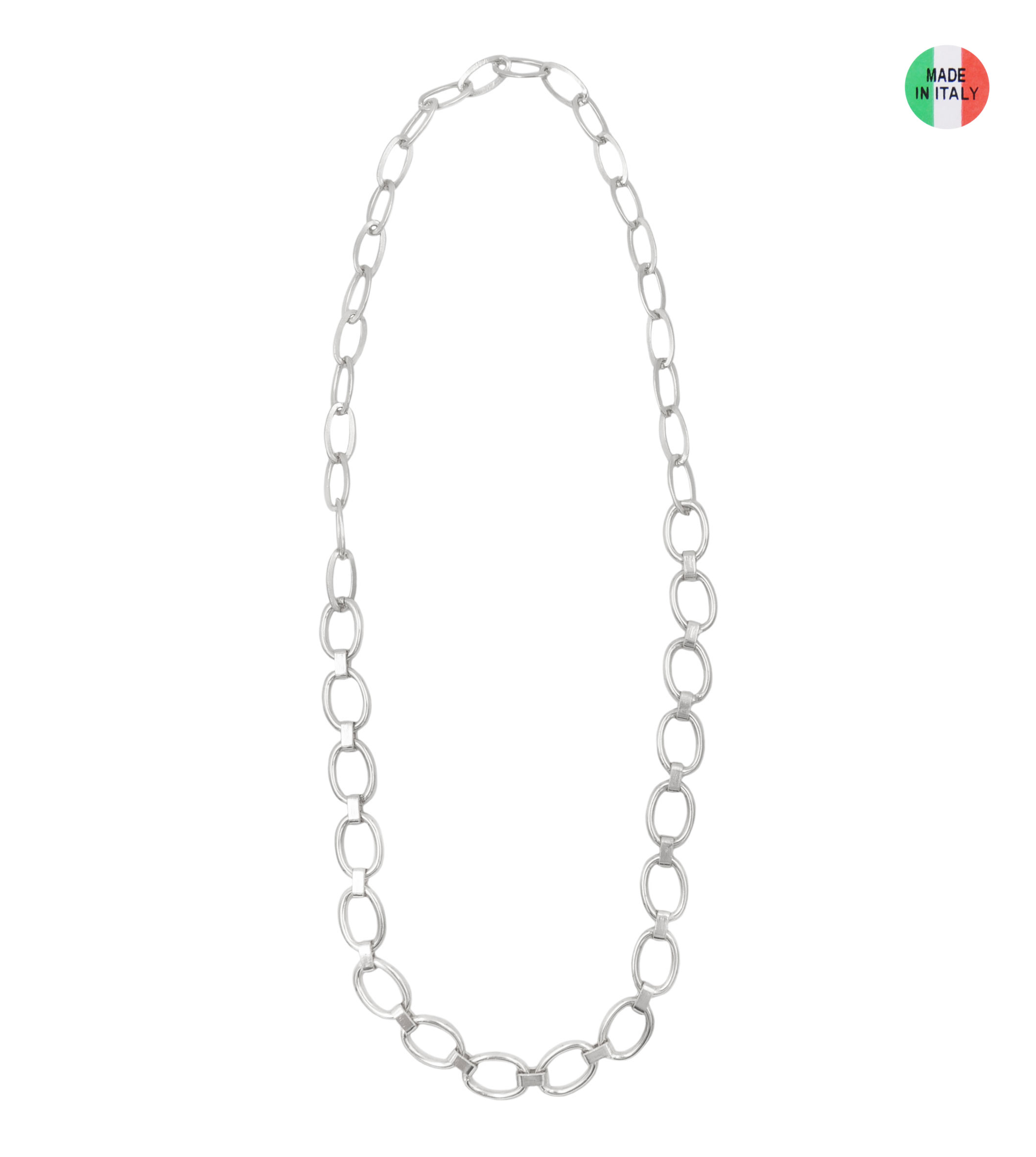 Collana catena in metallo, disponibile oro o rodio, lunghezza 100 cm, sacchetto in organza incluso
