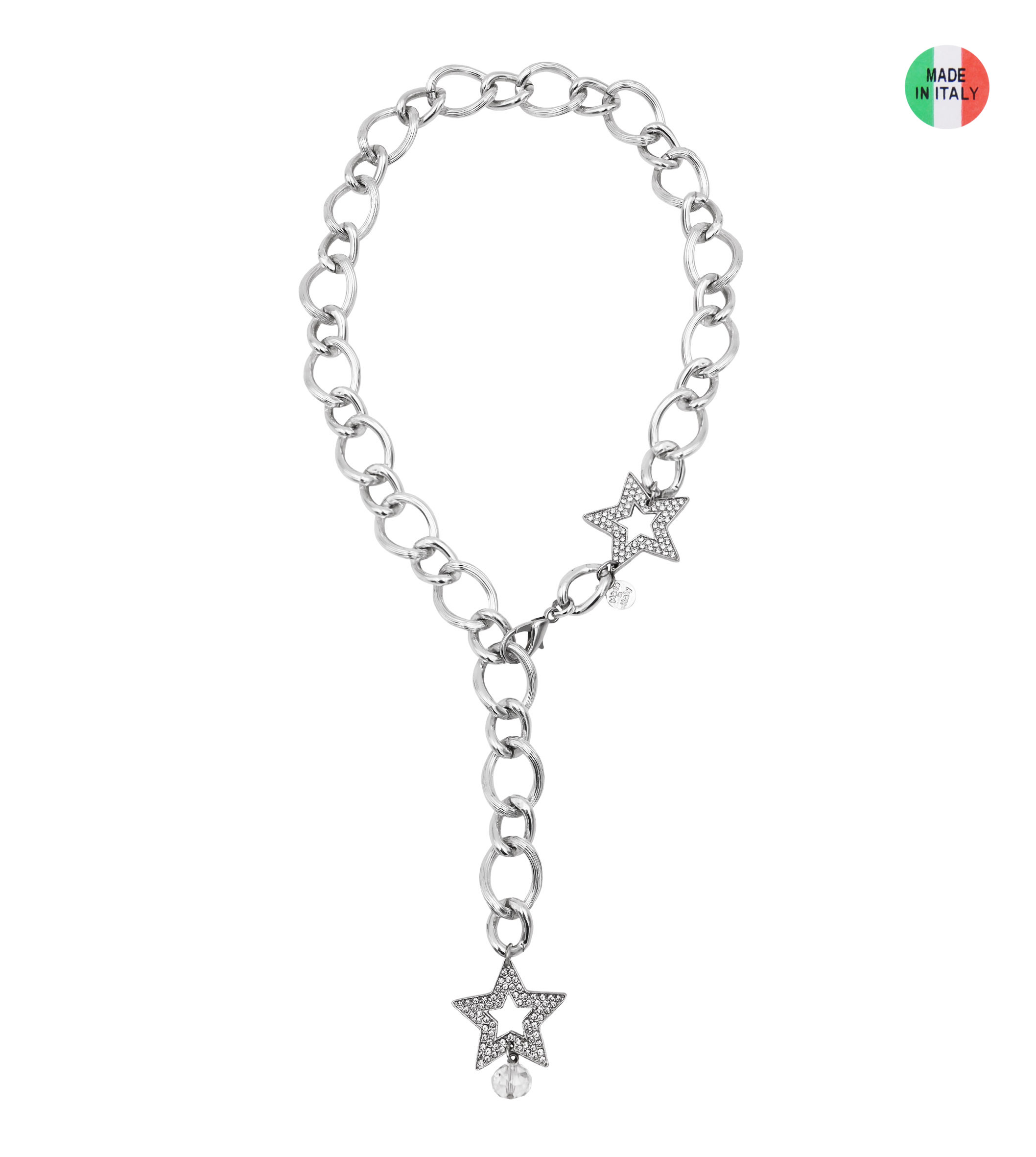 Collana catena rodio con stelle strass in metallo e vetro, lunghezza 50 cm, sacchetto in organza incluso
