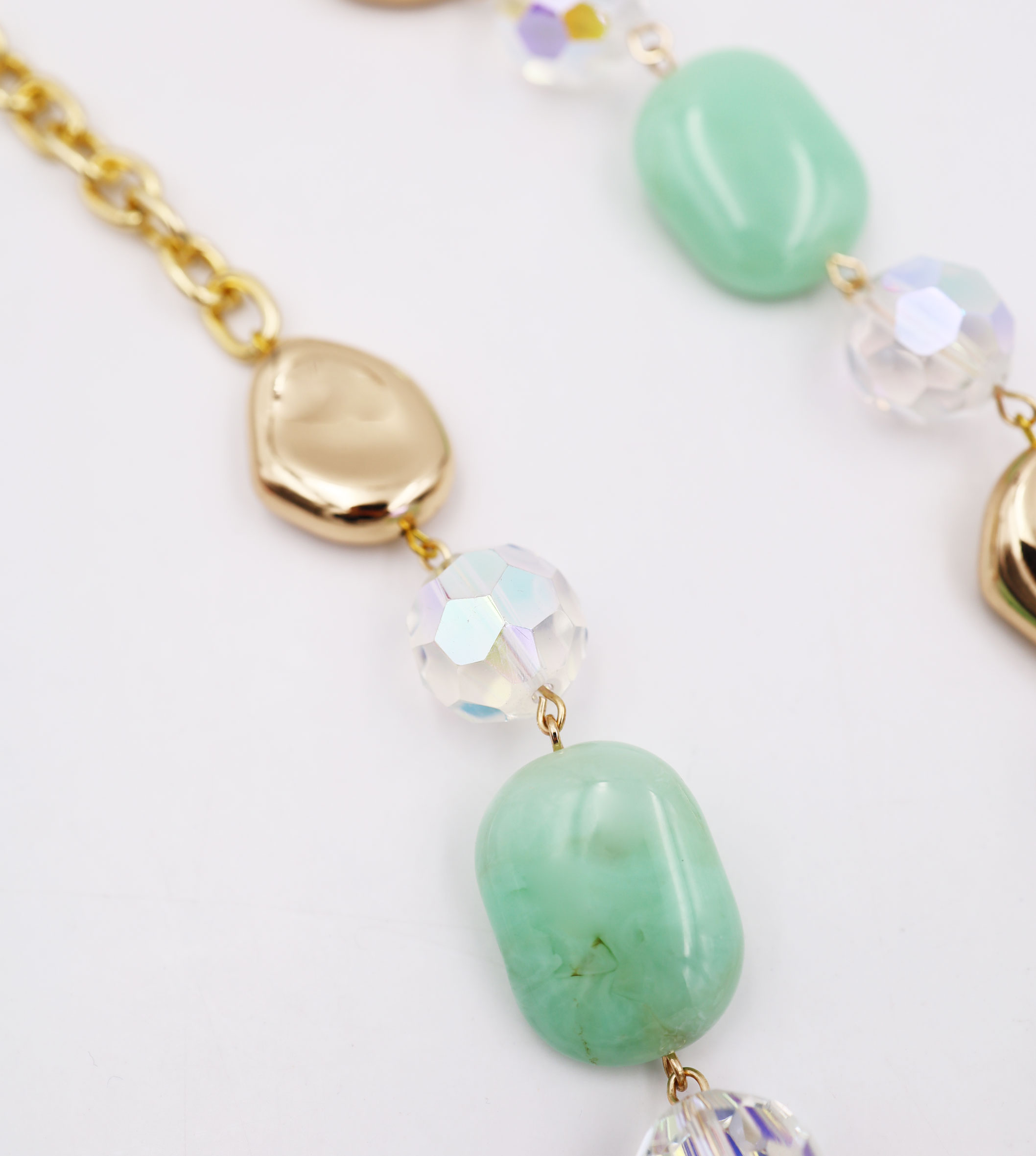 Collana girocollo con sassi e cristalli in metallo, plastica e vetro, disponibile fucsia, rosa o verde, lunghezza 52 cm, sacchetto in organza incluso
