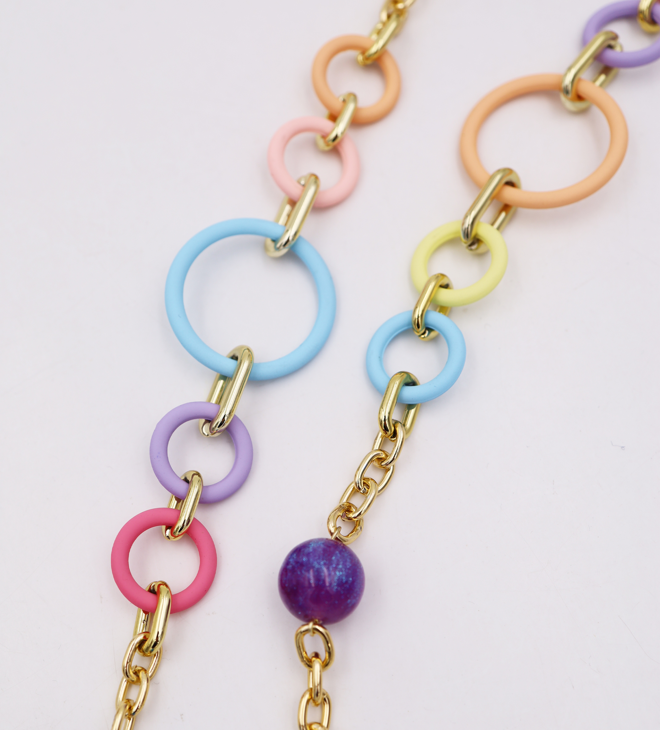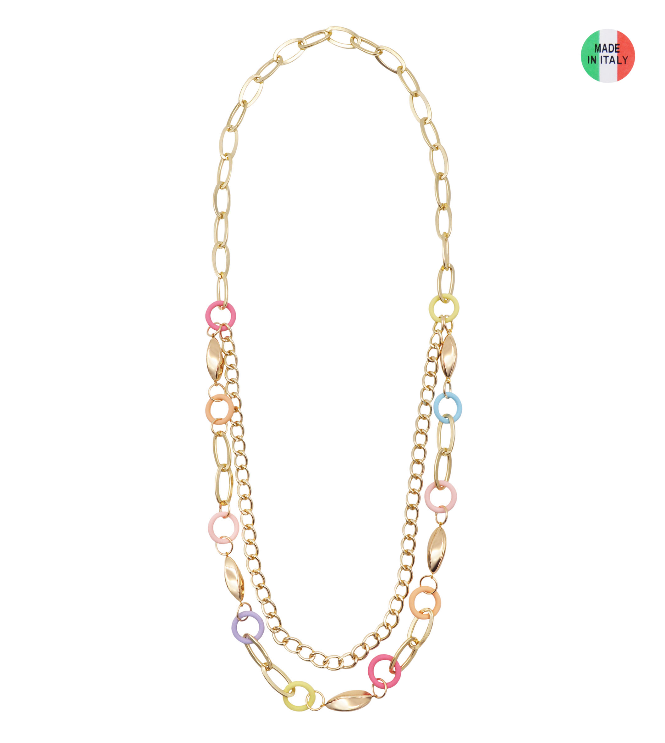 Collana catena multifilo con particolari gommati in plastica e metallo, lunghezza 100 cm, sacchetto in organza incluso