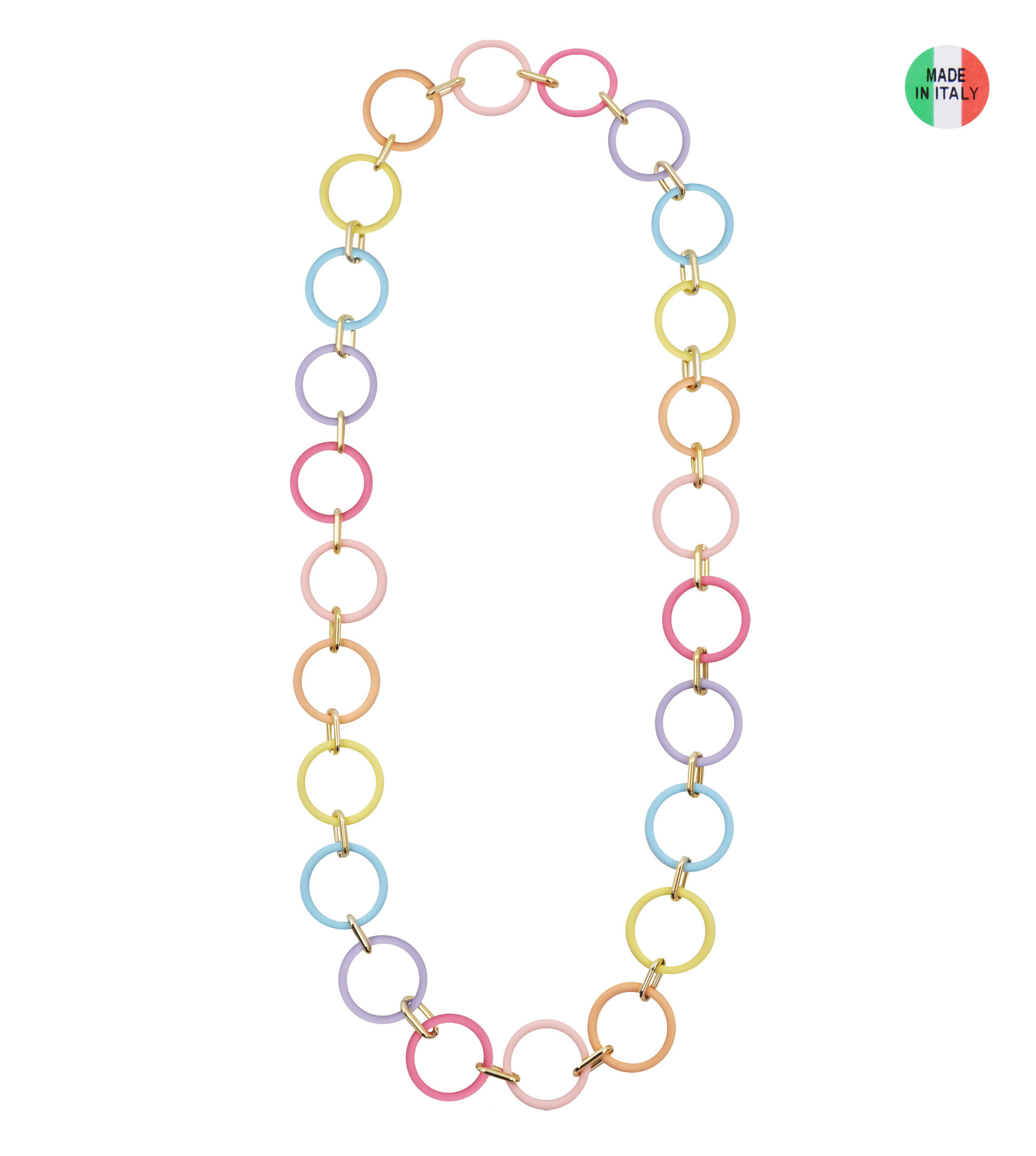 Collana con tondi gommati in plastica e metallo, lunghezza 100 cm, sacchetto in organza incluso