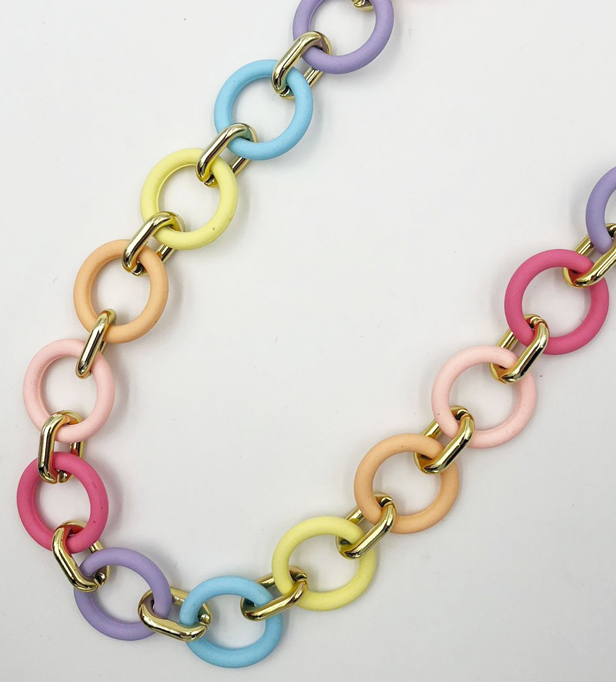 Collana catena multifilo con particolari gommati in plastica e metallo, lunghezza 100 cm, sacchetto in organza incluso