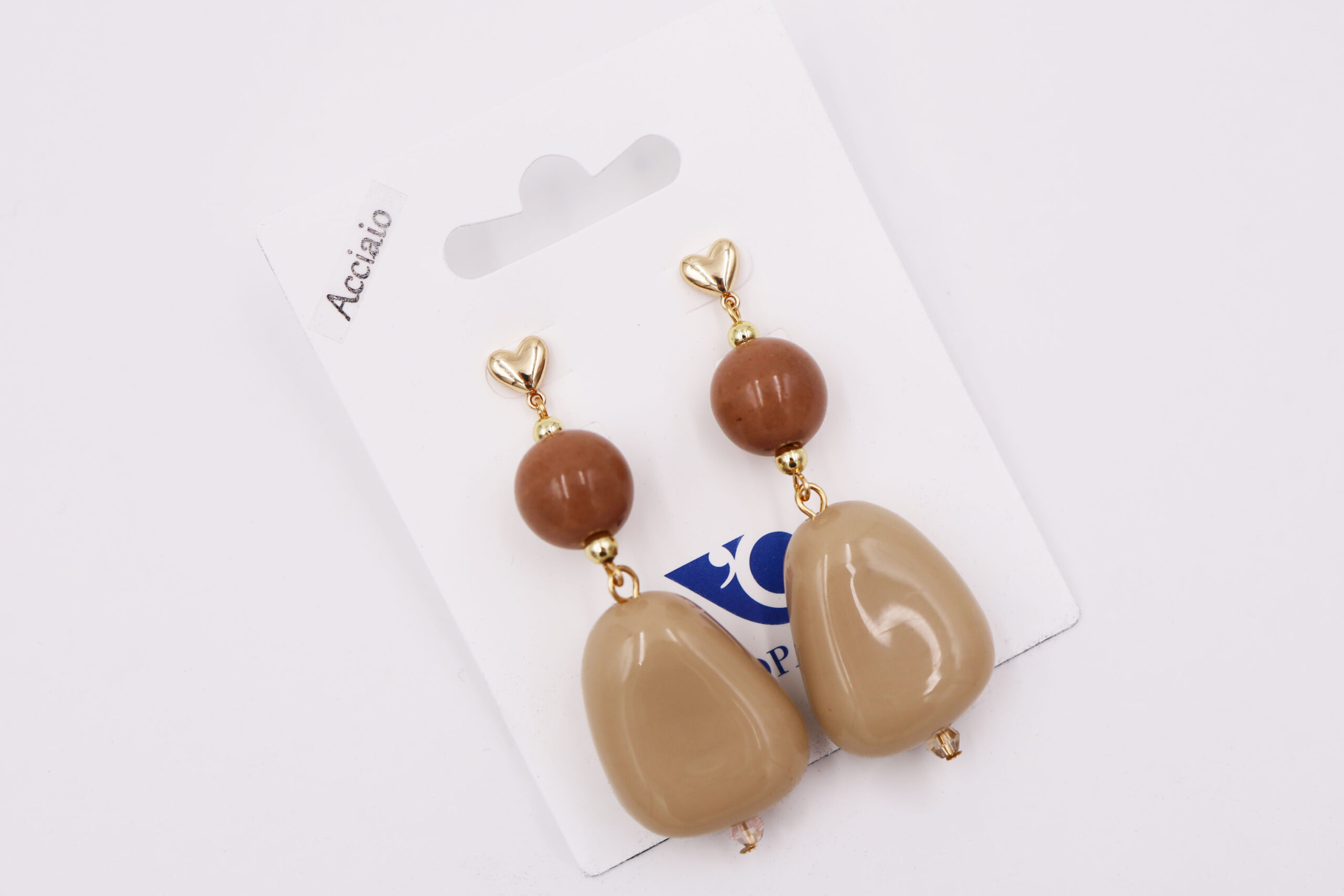 Orecchino amo con sfere in acciaio e resina, disponibile naturale, marrone o azzurro, lunghezza 7 cm, sacchetto in organza incluso