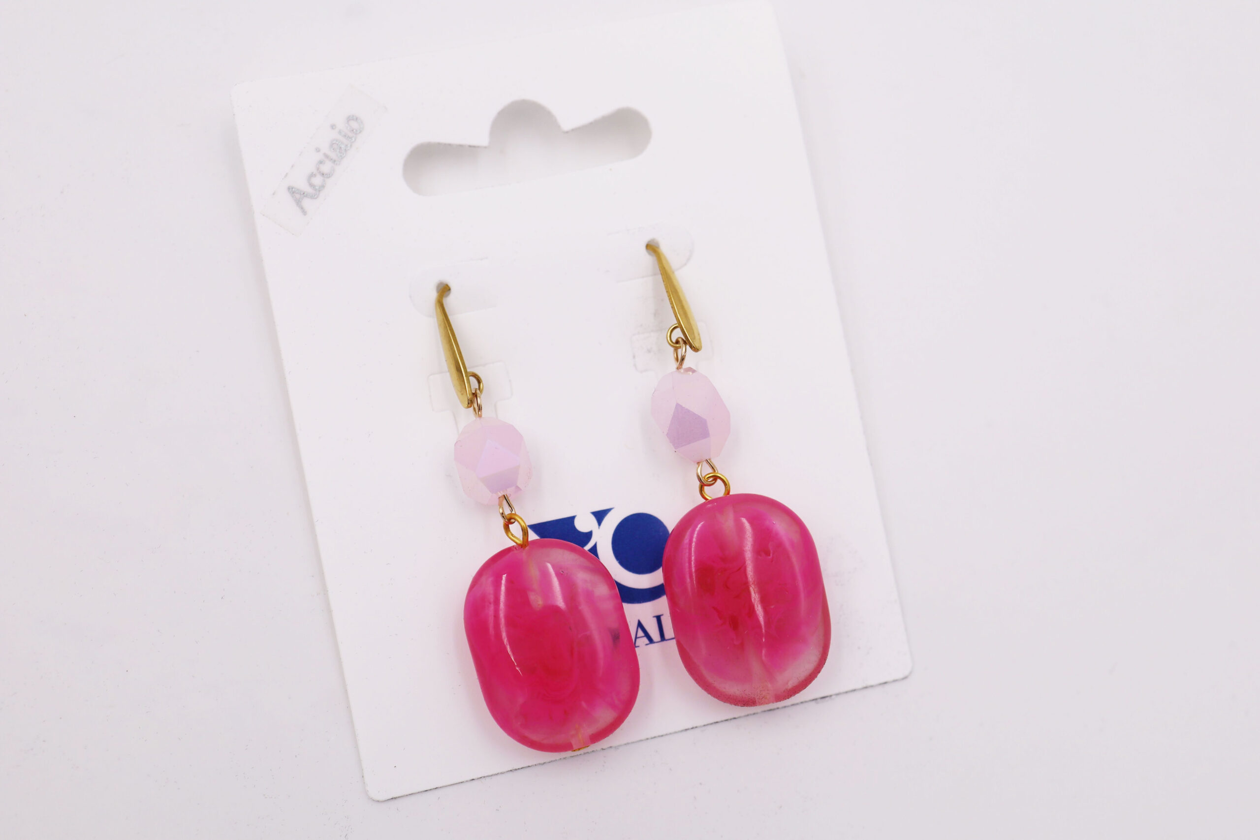 Orecchino amo con particolari in acciaio e resina, disponibile beige, fucsia o verde, lunghezza 6 cm, sacchetto in organza incluso