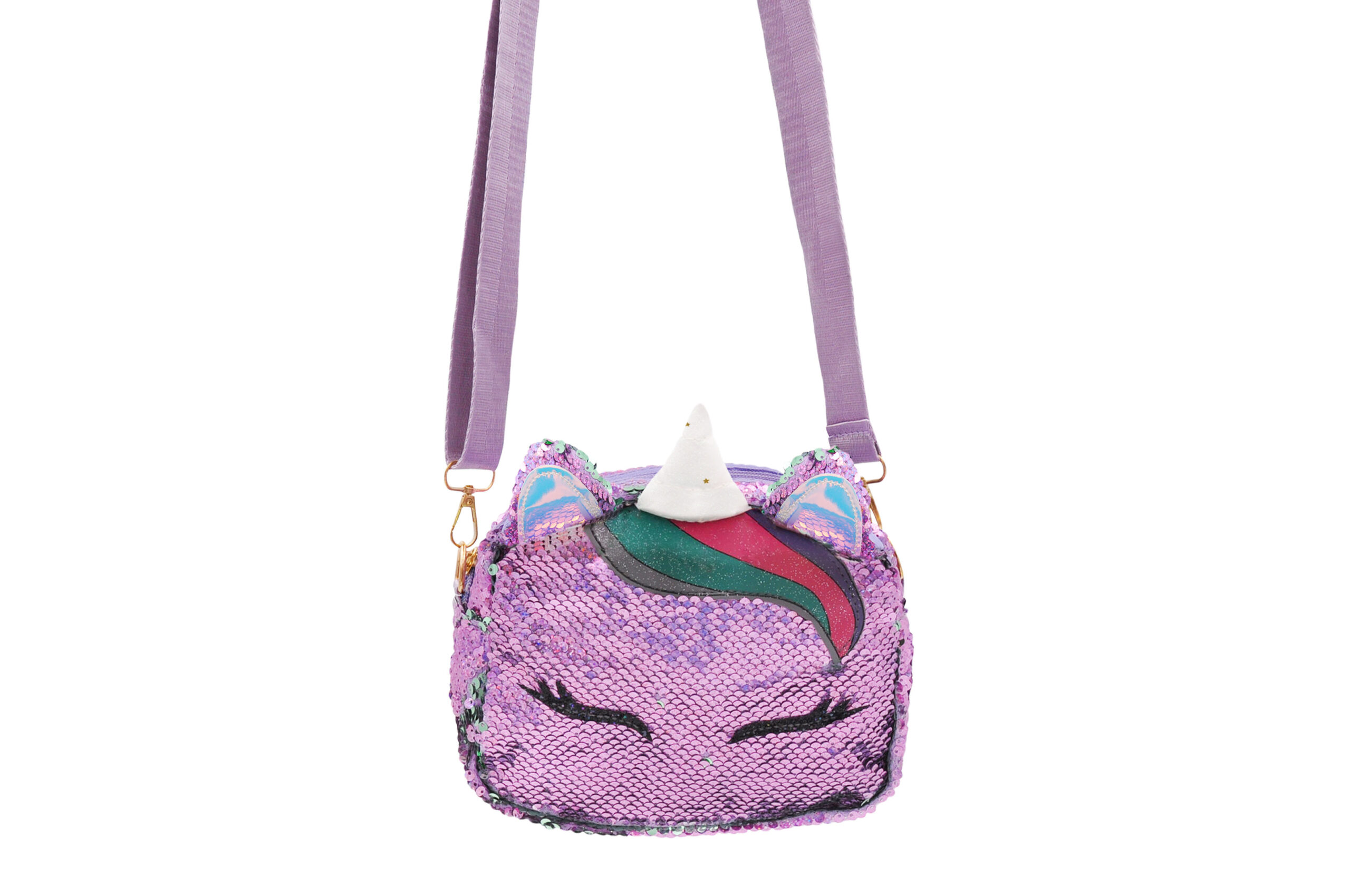 Pochette unicorno paillettes e tracolla, disponibile viola, rosa e azzurro, vendita singola, prezzo al pezzo