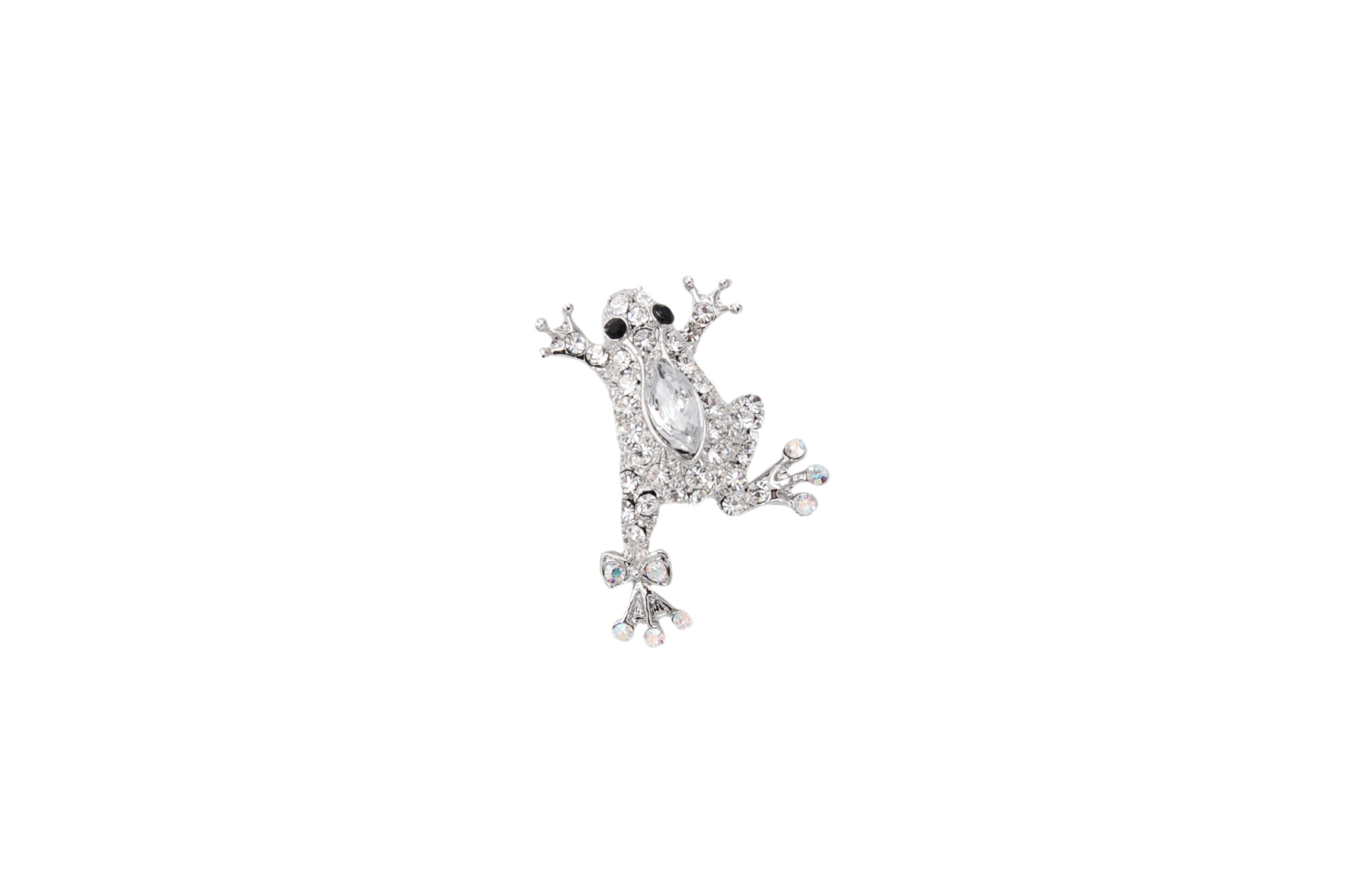 Spilla rodio rana strass in metallo e vetro, misure 3 x 4 cm, sacchetto in organza incluso